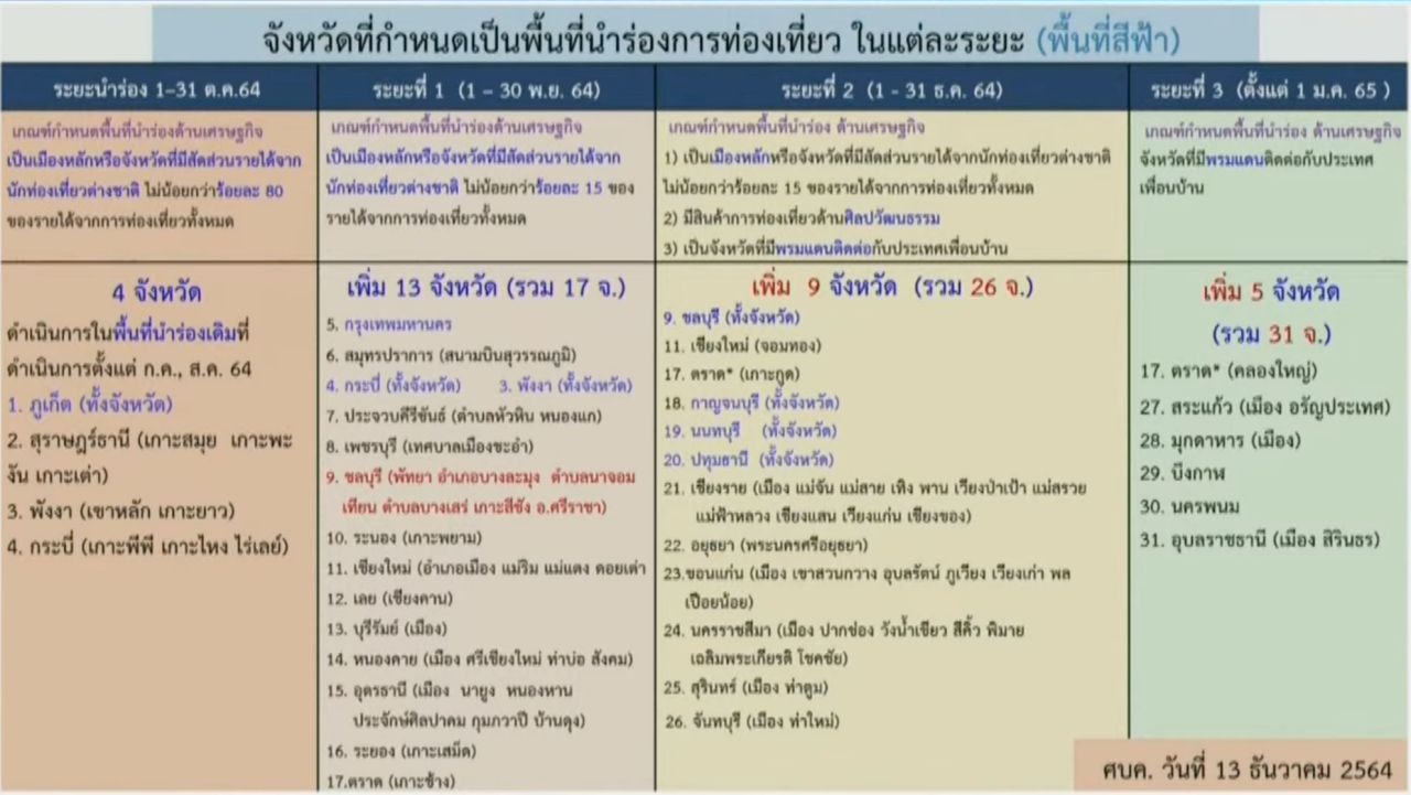 จากเดิมพื้นที่ควบคุมสูงสุด (สีแดง) 23 จังหวัด ปรับออกทั้งหมด พื้นที่ควบคุม (สีส้ม) เดิม 23 จังหวัด ปรับเพิ่มเป็น 39 จังหวัด พื้นที่เฝ้าระวังสูง (สีเหลือง) จาก 24 จังหวัด เพิ่มเป็น 30 จังหวัด และพื้นที่นำร่องการท่องเที่ยว (สีฟ้า) ปรับเพิ่มอีก 1 จังหวัดเป็น 8 จังหวัด แบ่งเป็นดังนี้