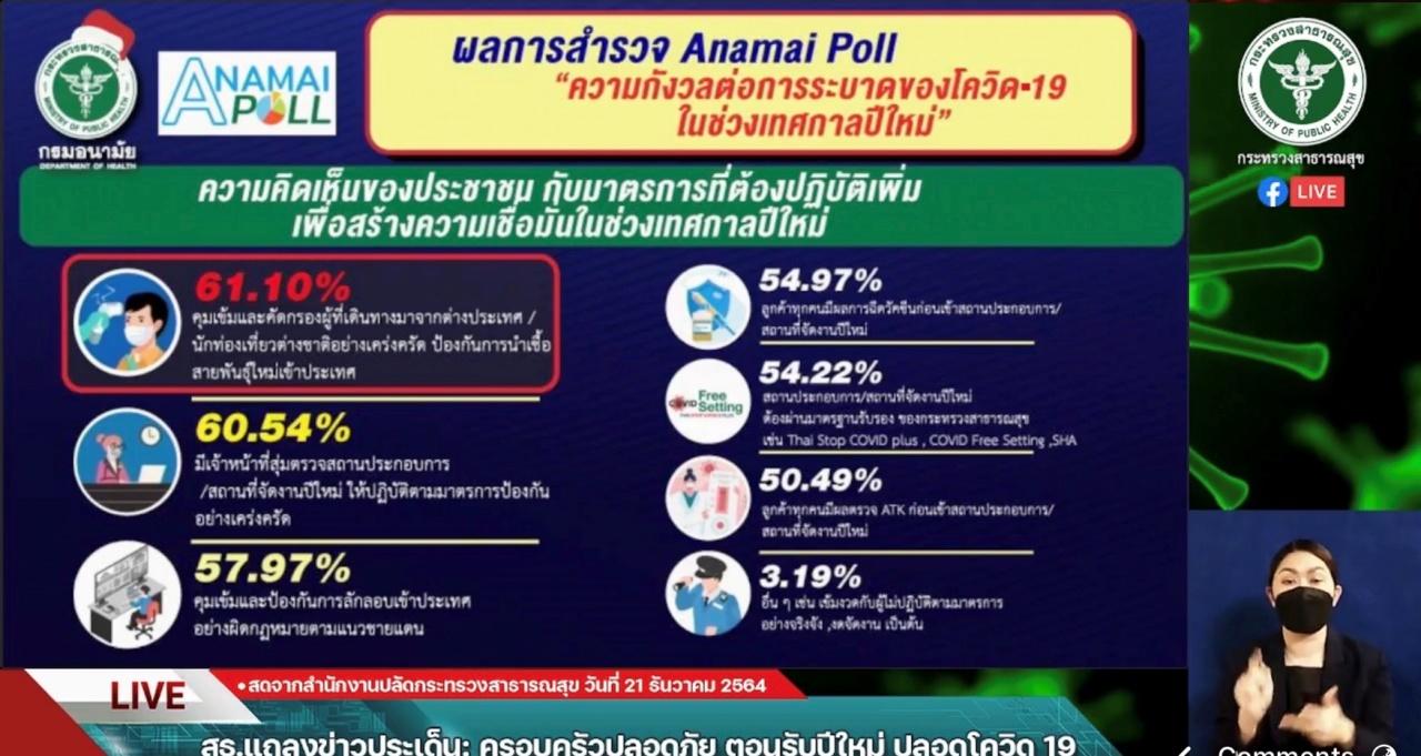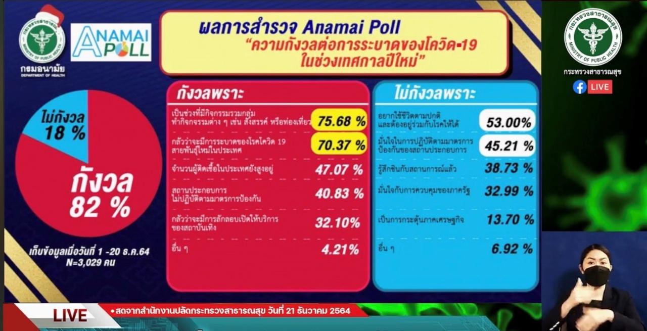 ส่วนผลโพลของ Anamai Poll เรื่องความกังวลต่อการระบาดของโควิด-19 ในช่วงเทศกาลปีใหม่ พบว่าประชาชนมีความกังวลถึง 82% และไม่กังวล 18% โดยส่วนใหญ่กังวลเพราะช่วงดังกล่าวจะมีการรวมกลุ่ม ทำกิจกรรมต่างๆ สังสรรค์ และท่องเที่ยว อีกทั้งยังมองว่าสถานที่ที่จะทำให้เกิดการแพร่ระบาดของโควิด-19 มากที่สุดคือ ผับ บาร์ คาราโอเกะ แต่ส่วนใหญ่มีแผนจะสังสรรค์เทศกาลปีใหม่ที่บ้านพัก