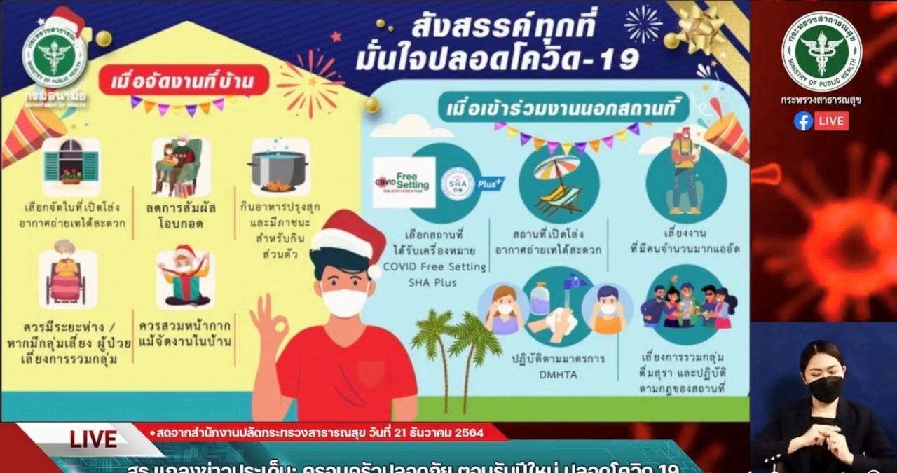 ส่วนการจัดงานปีใหม่ในบ้าน แนะนำให้จัดในสถานที่โล่งอากาศถ่ายเท ลดการสัมผัสโอบกอด ควรสวมหน้ากากอนามัยในบ้าน โดยเฉพาะเมื่อมีกลุ่มคนเปราะบางในบ้าน เนื่องจากส่วนใหญ่การติดเชื้อพบว่ามาจากคนใกล้ชิดและคนในบ้าน ส่วนการเข้าร่วมงานนอกสถานที่ ควรเลือกสถานที่ที่ได้รับเครื่องหมาย Covid Free Setting หรือ SHA Plus งดสถานที่แออัด เลี่ยงการดื่มสุรา