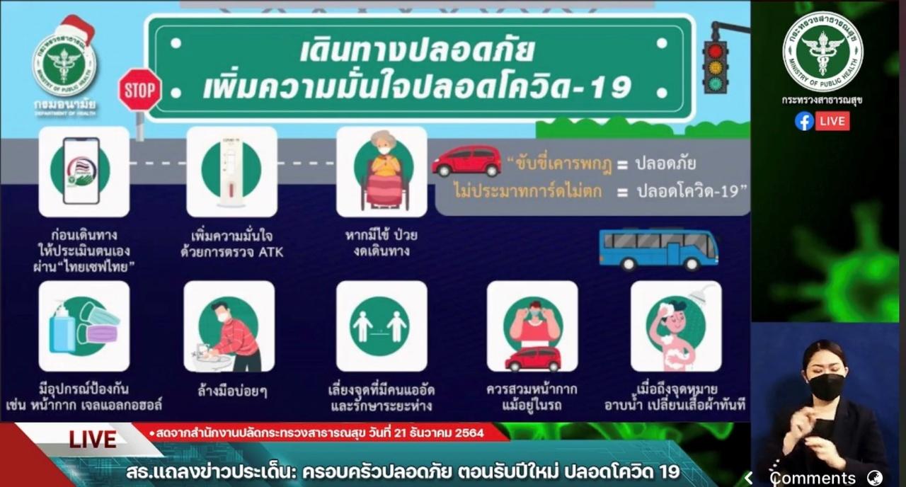 วันที่ 21 ธันวาคม 2564 ที่กระทรวงสาธารณสุข นายแพทย์สุวรรณชัย วัฒนายิ่งเจริญชัย อธิบดีกรมอนามัย แถลงข่าวถึงประเด็น ครอบครัวปลอดภัย ตอนรับปีใหม่ ปลอดโควิด-19 ว่า ช่วงวันหยุดยาวหลายครอบครัวจะเดินทางไปท่องเที่ยวและกลับภูมิลำเนา แม้ภาพรวมสถานการณ์โควิด-19 ในไทยจะดีขึ้น และฉีดวัคซีนแล้ว 100 ล้านโดส แต่ทางกระทรวงสาธารณสุขจะยังคงเฝ้าระวังต่อเนื่อง
