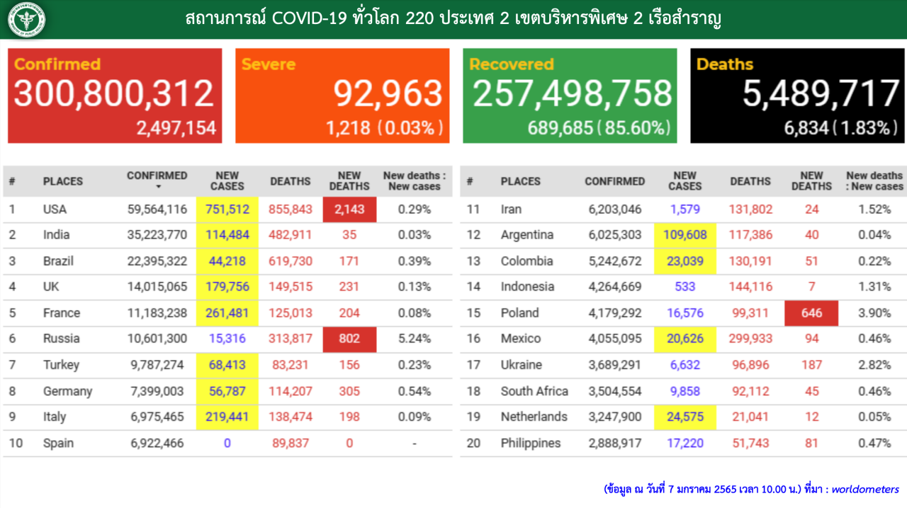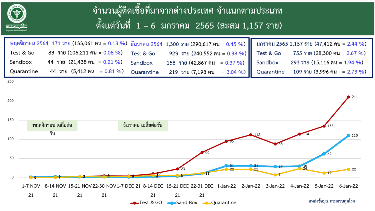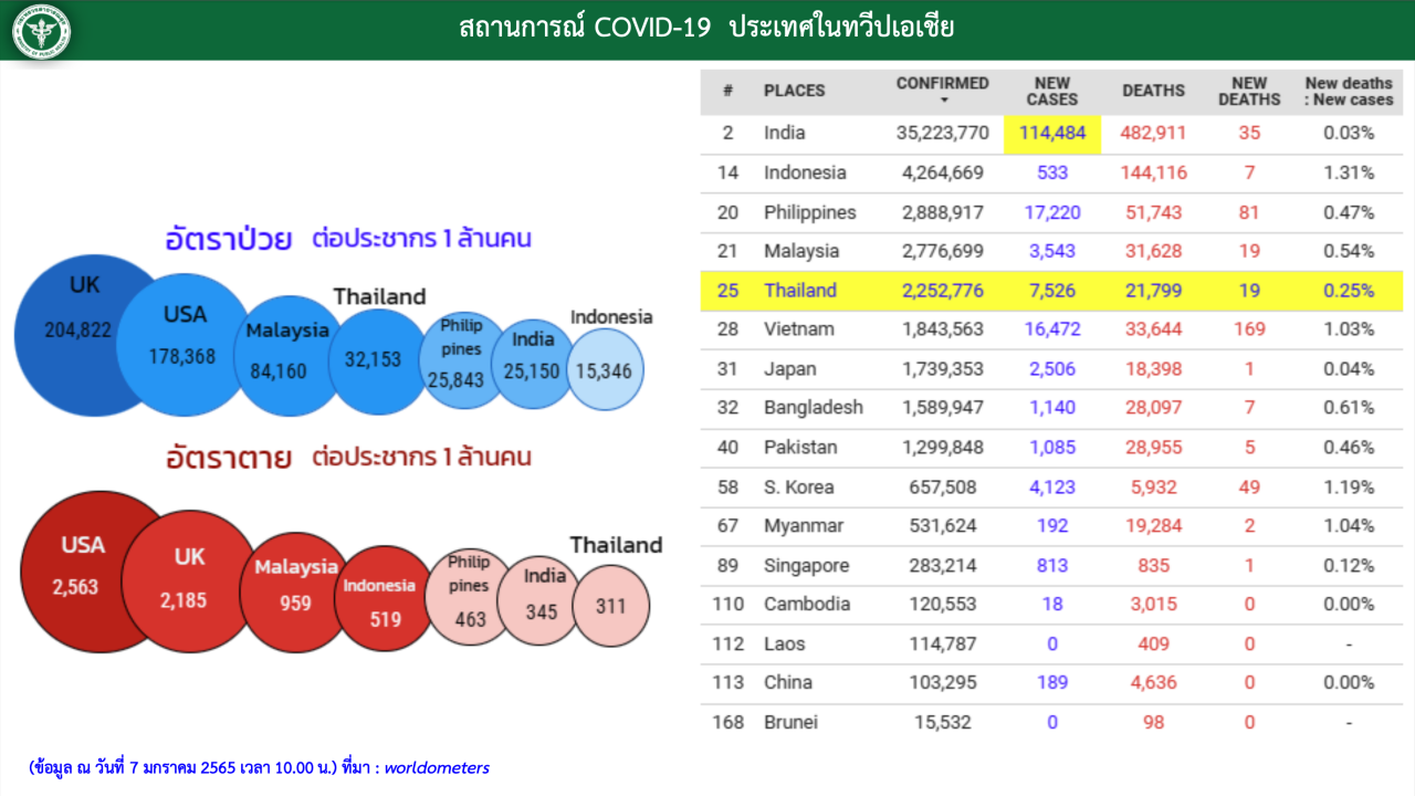 เมื่อเวลา 12.30 น. วันที่ 7 ม.ค. 2565 นายแพทย์ทวีศิลป์ วิษณุโยธิน โฆษกศูนย์บริหารสถานการณ์การแพร่ระบาดของโรคติดเชื้อไวรัสโคโรนา 2019 (โควิด-19) หรือ ศบค. และกระทรวงสาธารณสุข รายงานสถานการณ์ผู้ติดเชื้อโควิด-19 ในประเทศไทยมีรายละเอียดดังนี้