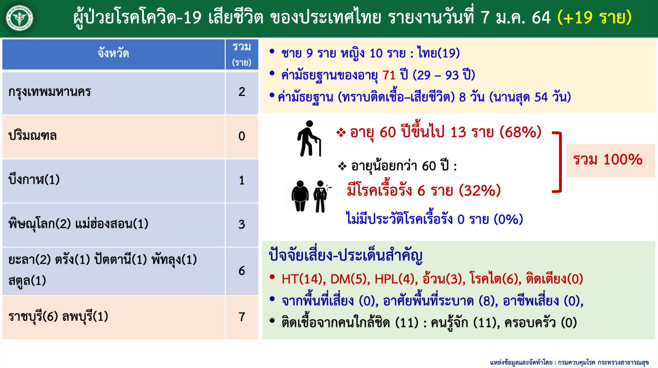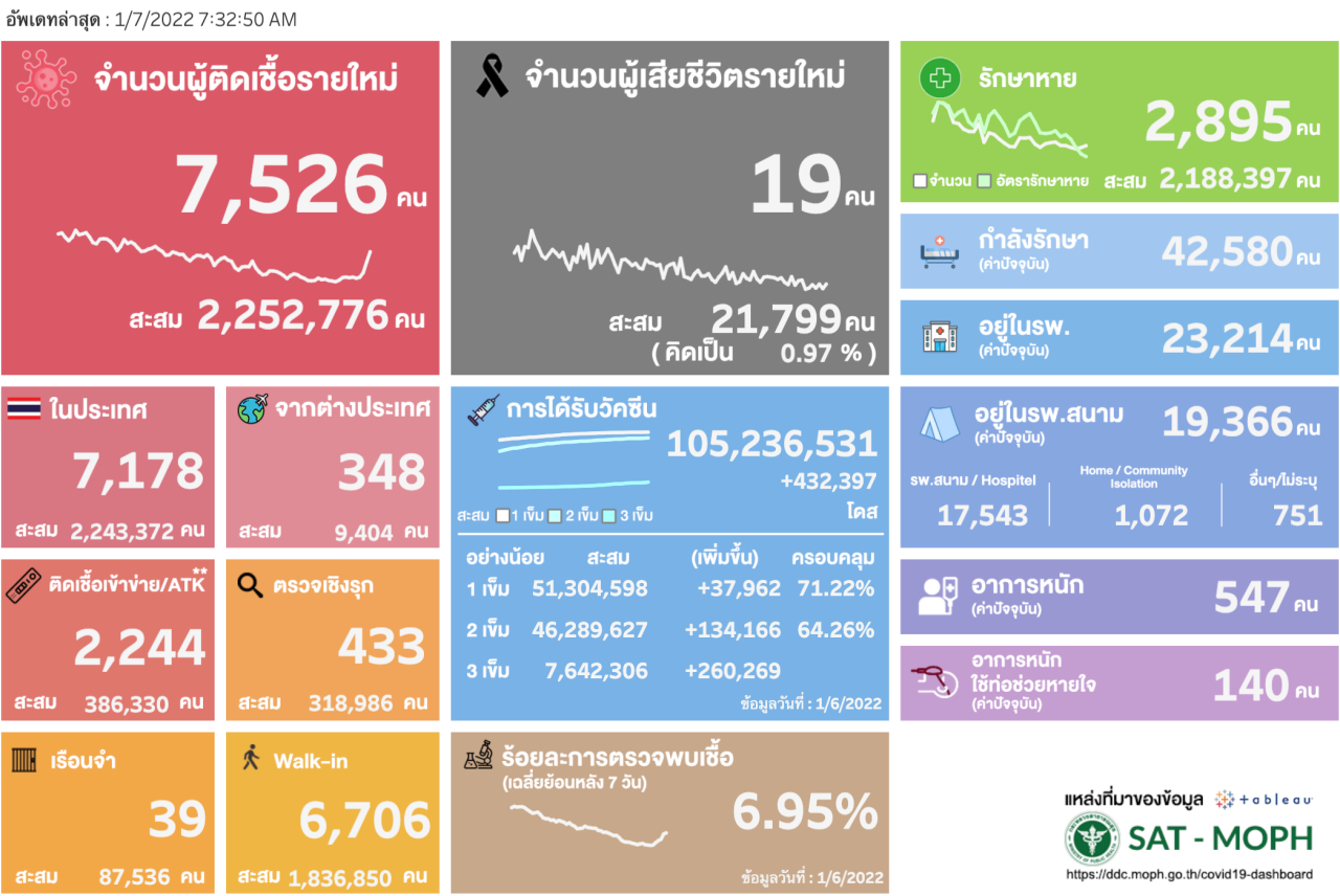 ศบค. รายงานสถานการณ์โควิดวันนี้ 7 ม.ค. 65 ผู้ติดเชื้อทะลุ 7,500 ราย เสียชีวิต 19 ศพ อยู่ระหว่างรักษา 4.2 หมื่นราย อาการหนัก 547 ราย ชลบุรีติดเชื้ออันดับ 1 ของประเทศ ผลตรวจ ATK บวก 2,244 ราย