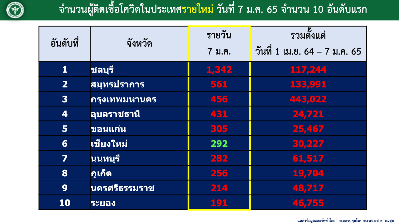 ส่วนผู้ติดเชื้อรายจังหวัดมากที่สุด 5 จังหวัดประจำวันนี้ อันดับ 1 คือ ชลบุรี 1,342 ราย รองลงมา สมุทรปราการ 561 ราย กรุงเทพมหานคร 456 ราย อุบลราชธานี 431 ราย และขอนแก่น 305 ราย