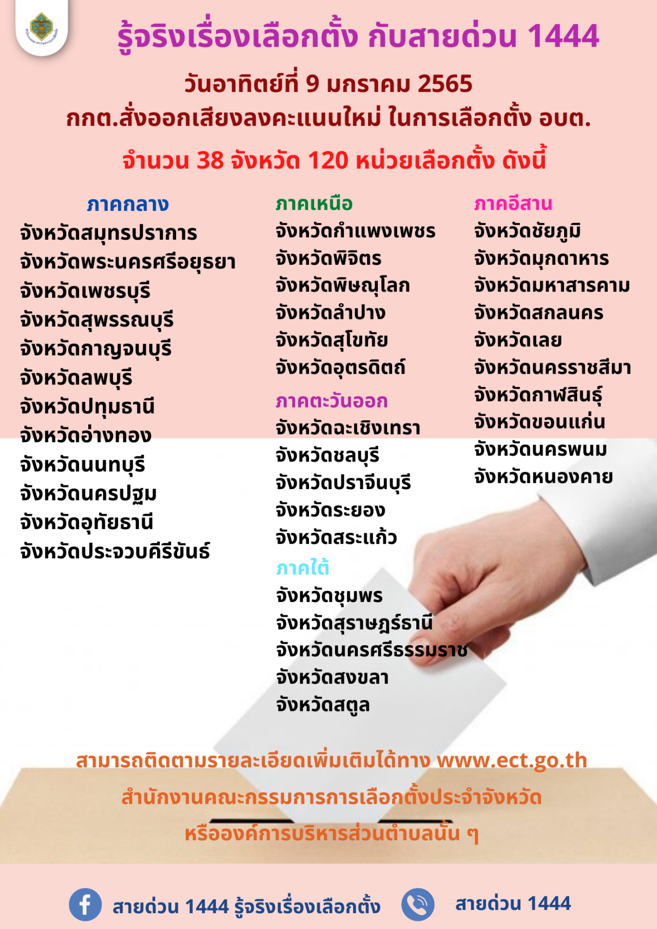 วันที่ 8 ม.ค. 2565 สำนักงานคณะกรรมการการเลือกตั้ง (กกต.) ประชาสัมพันธ์เน้นย้ำการเลือกตั้งสมาชิกสภาองค์การบริหารส่วนตำบลและนายกองค์การบริการส่วนตำบล หรือ เลือกตั้ง อบต. ซึ่ง กกต. สั่งให้มีการออกเสียงลงคะแนนใหม่รวม 32 จังหวัด 120 หน่วยเลือกตั้ง ในวันอาทิตย์ที่ 9 ม.ค. 2565 ตั้งแต่เวลา 08.00 - 17.00 น.