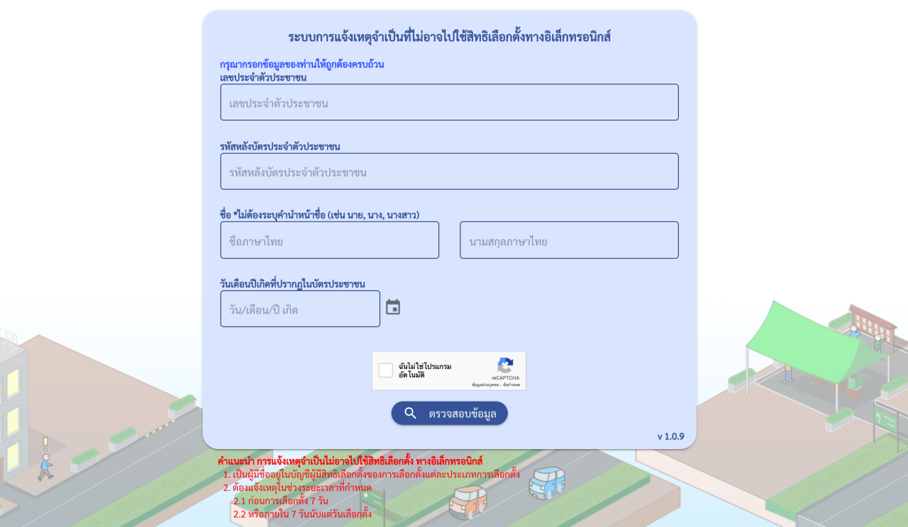 2. กรอกข้อความในแบบแจ้งเหตุที่ไม่อาจไปใช้สิทธิ์เลือกตั้งให้ถูกต้องครบถ้วน และปฏิบัติตามขั้นตอนที่กำหนด เมื่อยืนยันข้อความที่ได้กรอกแล้ว ระบบจะแจ้งเหตุจำเป็นที่ไม่อาจไปใช้สิทธิ์เลือกตั้งให้โดยอัตโนมัติ