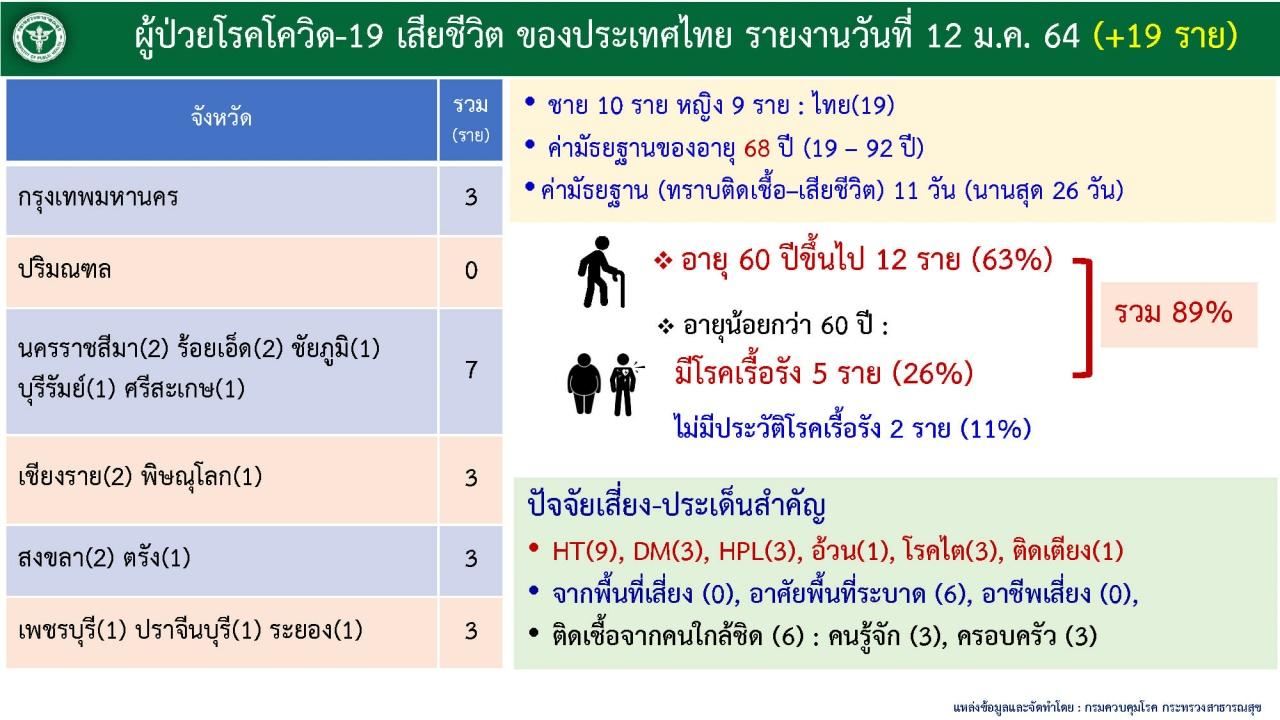 ขณะที่กลุ่มผู้เสียชีวิต จำนวน 19 ราย พบว่าเป็นชาย 10 ราย หญิง 9 ราย โดยกลุ่มผู้เสียชีวิตส่วนใหญ่ยังเป็นกลุ่มเสี่ยงอายุมากกว่า 60 ปีขึ้นไป จำนวน 12 ราย และมีโรคเรื้อรังถึง 5 ราย มีรายละเอียดออกมาว่าเป็นผู้ที่ไม่ได้รับวัคซีน หรือได้รับวัคซีนไม่ครบโดส ถึง 15 ราย จาก 19 ราย หรือ 79%
