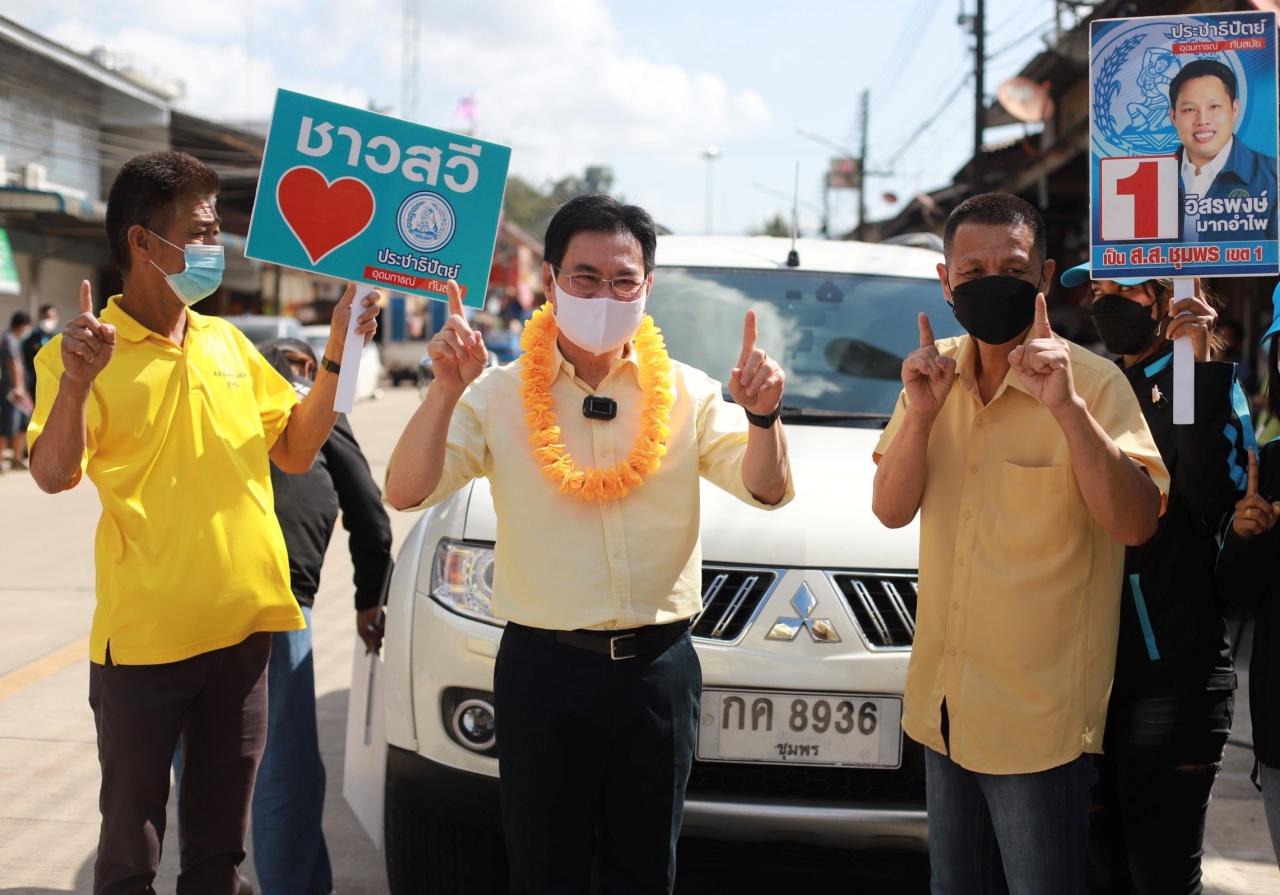 วันที่ 15 ม.ค. 2565 ที่ตลาดสถานีรถไฟสวี จังหวัดชุมพร นายจุรินทร์ ลักษณวิศิษฏ์ หัวหน้าพรรคประชาธิปัตย์ รองนายกรัฐมนตรี และรัฐมนตรีว่าการกระทรวงพาณิชย์ นำทีมประชาธิปัตย์ พร้อมด้วยผู้สมัคร "น้องตาร์ท" นายอิสรพงษ์ มากอำไพ เดินรณรงค์หาเสียง พร้อมด้วย นายสินิตย์ เลิศไกร รมช.กระทรวงพาณิชย์ นายธีระชาติ ปางวิรุฬห์รัตน์ อดีต ส.ส.ชุมพร