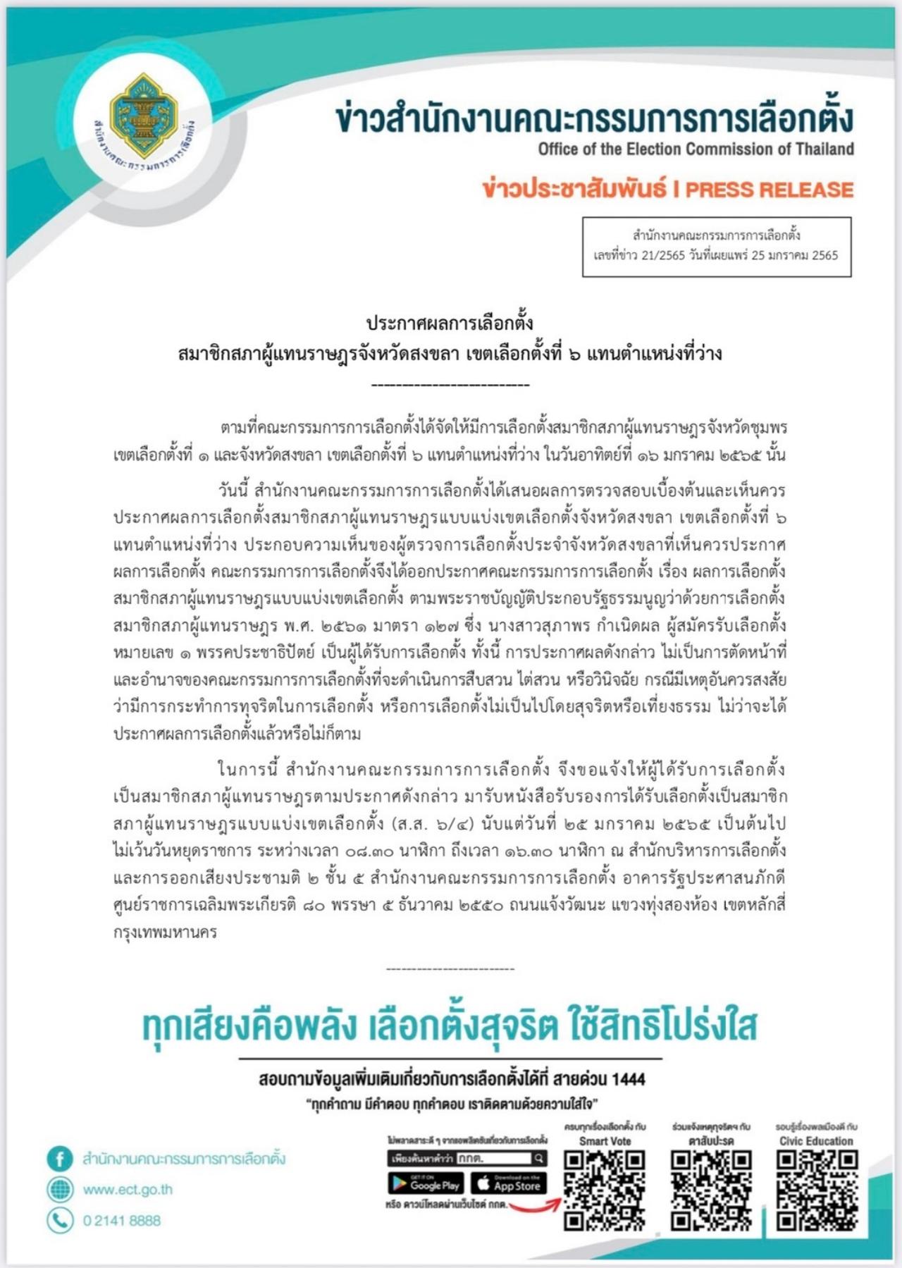 วันที่ 25 ม.ค. 2565 สำนักงานคณะกรรมการการเลือกตั้ง (กกต.) ประกาศผลการเลือกตั้งสมาชิกสภาผู้แทนราษฎรจังหวัดสงขลา เขตเลือกตั้งที่ 6 แทนตำแหน่งที่ว่าง ซึ่ง กกต. มีการจัดเลือกตั้งในวันที่ 16 มกราคม 2565 พร้อมๆ กับเลือกตั้งซ่อม ส.ส.ชุมพร เขตเลือกตั้งที่ 1 นั้น
