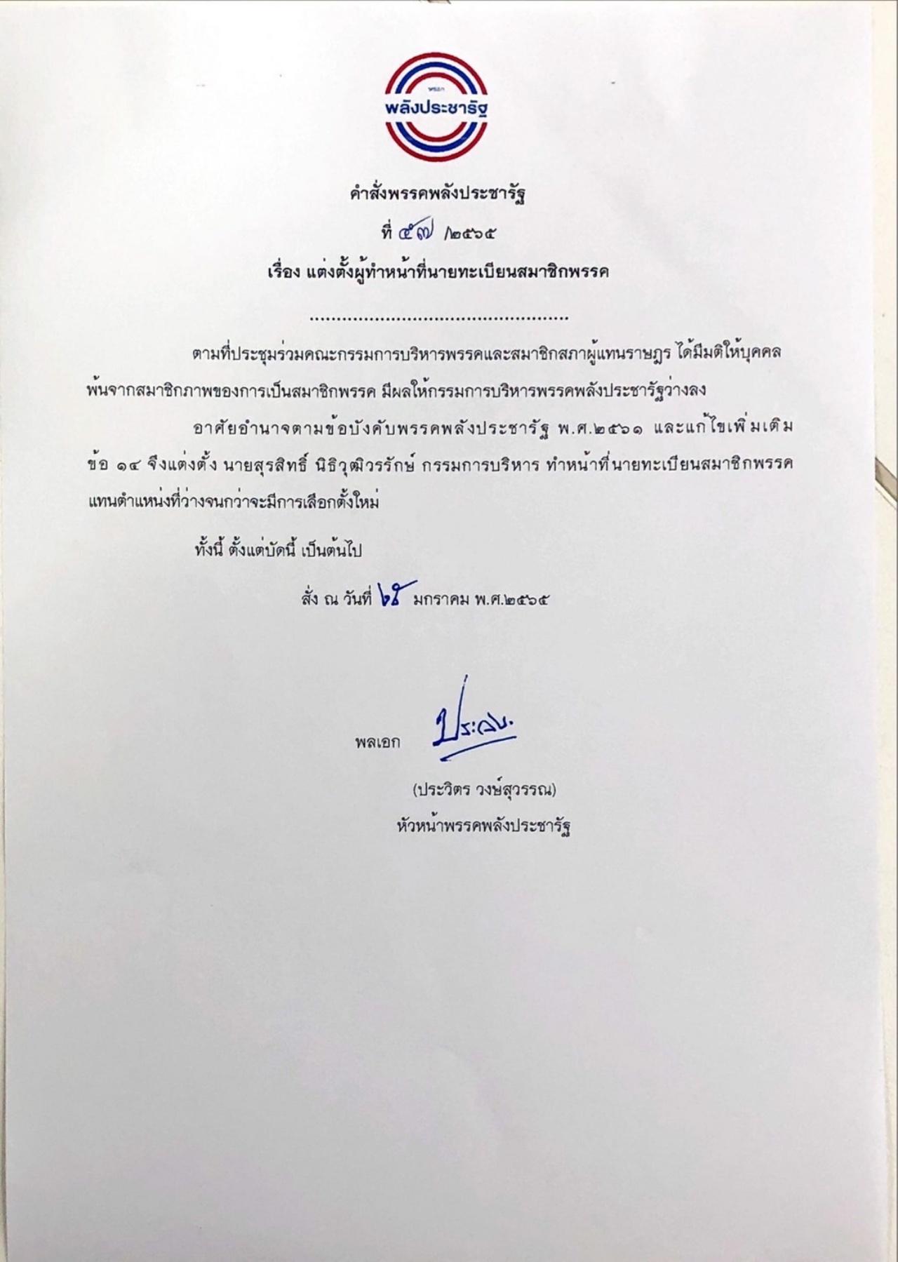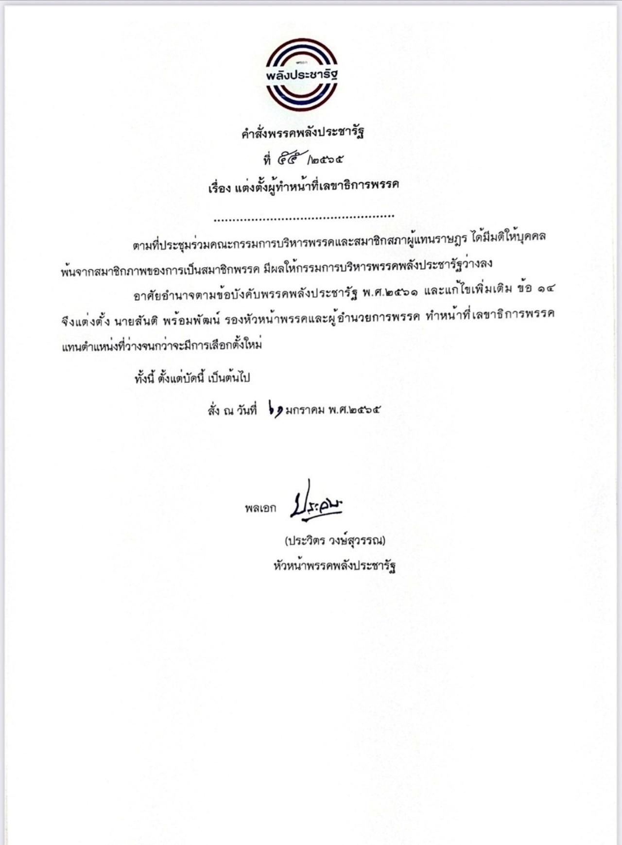 วันที่ 27 ม.ค. 2565 ผู้สื่อข่าวรายงานว่า พล.อ.ประวิตร วงษ์สุวรรณ รองนายกรัฐมนตรี ในฐานะหัวหน้าพรรคพลังประชารัฐ (พปชร.) ลงนามในคำสั่งพรรคพลังประชารัฐ ที่ 55/2565 เรื่องแต่งตั้งผู้ทำหน้าที่เลขาธิการพรรค ระบุว่าตามที่ประชุมร่วมคณะกรรมการบริหารพรรคและสมาชิกสภาผู้แทนราษฎร ได้มีมติให้บุคคล พ้นจากสมาชิกภาพของการเป็นสมาชิกพรรค มีผลให้กรรมการบริหารพรรคพลังประชารัฐว่างลง