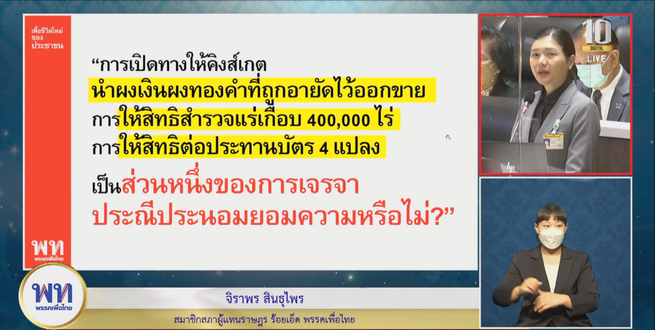 จากนั้น น.ส.จิราพร ได้ตั้งคำถามมากมาย อาทิ ถูกเลื่อนการออกคำชี้ขาดออกใน 2 ปี เลื่อนไม่ต่ำกว่า 4 ครั้ง และครั้งล่าสุดเลื่อนไม่มีกำหนด ใครเป็นคนขอเลื่อน เลื่อนเพราะอะไร ใครได้หรือเสียประโยชน์หรือไม่ ตั้งแต่ถูกฟ้องร้อง ไทยไม่เคยรายงานว่าถูกฟ้องประเด็นใดบ้าง ค่าเสียหายเท่าไร มีอะไรบ้าง และจะบ่ายเบี่ยงไม่ตอบไม่ได้ อ้างเป็นความลับไม่ได้ เพราะอนุญาโตตุลาการให้เปิดเผยบางส่วนได้ คิงส์เกตฟ้องร้องประเทศไทย คนไทยไม่ได้รู้เรื่องด้วย แล้วเหตุใดคนไทยจะรู้ไม่ได้ และถ้าไทยแพ้คดีใครจะรับผิดชอบ พล.อ.ประยุทธ์ หรือ ประเทศ ซึ่งที่ผ่านมา คิงส์เกตยืนยันว่ามีโอกาสที่จะได้ผลลัพธ์ที่ประสบความสำเร็จ หากการเจรจาประนีประนอมยอมความกับไทยไม่สำเร็จ จึงขอให้ช่วยตอบให้ชัด ชี้แจงต่อสภาฯ อย่างตรงไปตรงมา รวมถึงการให้ต่างๆ ที่ผ่านมากับคิงส์เกตเป็นส่วนหนึ่งของการประนีประนอมยอมความหรือไม่ คดียังไม่ถึงที่สุดรัฐบาลก็เปิดเหมืองให้ทำต่อ และให้สิทธิ์พื้นที่ทำต่ออีก ต้องใช้สมบัติชาติสังเวยการใช้มาตรา 44 สั่งปิดเหมืองทองอัครา พร้อมถามต่อไปว่าไทยให้อะไรเขาถึงจะยอมความ เพราะไม่มีในโลกที่ใครจะยอมถอนฟ้องฟรีๆ พร้อมเปิดเผยเอกสารจากคิงส์เกตที่ระบุว่ามีการเจรจากับไทย