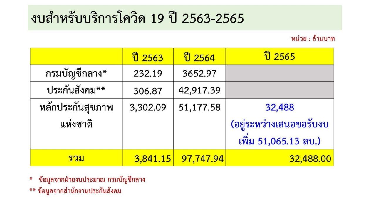 วันที่ 23 ก.พ. 2565 นายแพทย์ทวีศิลป์ วิษณุโยธิน โฆษกศูนย์บริหารสถานการณ์การแพร่ระบาดของโรคติดเชื้อไวรัสโคโรนา 2019 (โควิด-19) หรือ ศบค. เปิดเผยข้อมูลรายงานการจ่ายค่าบริการโควิด-19 ว่า ในปี 2563 มีการใช้จ่ายไป 3,841 ล้านบาท ปี 2564 ใช้จ่าย 97,747 ล้านบาท และปี 2565 ใช้จ่ายไป 32,488 ล้านบาท และอยู่ระหว่างเสนอขอรับงบประมาณเพิ่มอีก 51,065 ล้านบาท