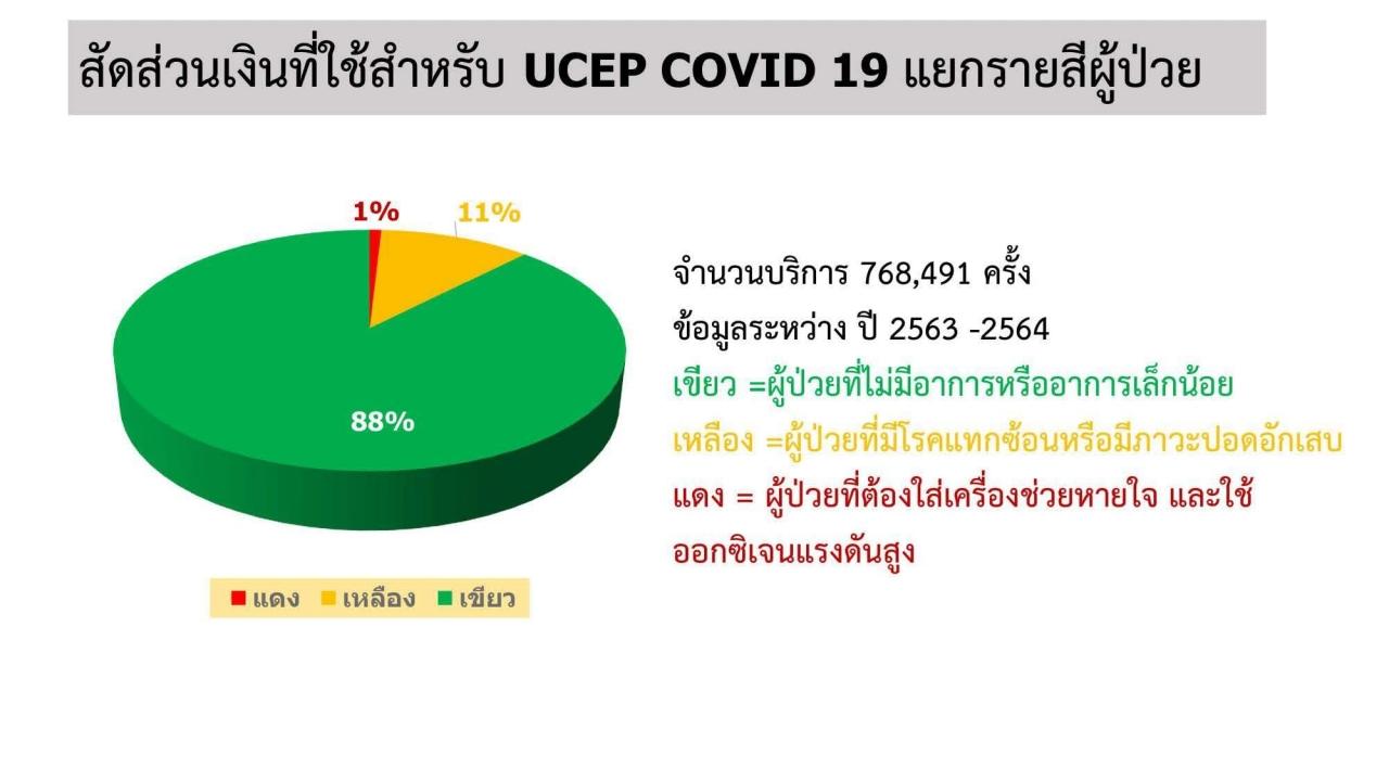 ทางด้านสัดส่วนเงินที่ใช้สำหรับความฉุกเฉิน UCEP โควิด-19 พบว่าเป็นสีเขียวถึง 88% สีเหลือง 11% และสีแดง 1% จำนวนบริการ 768,491 ครั้ง ข้อมูลช่วงปี 2563-2564