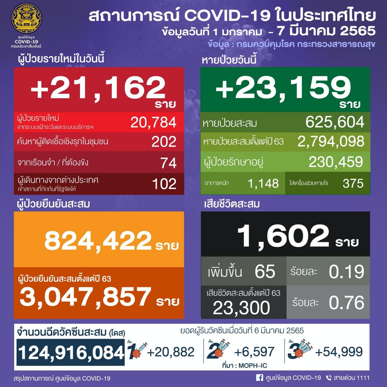 ศบค. รายงานสถานการณ์โควิดวันนี้ 7 มี.ค. 65 ติดเชื้อ 21,162 ราย เสียชีวิตนิวไฮ 65 ศพ ยอด ATK เข้าข่าย 24,236 ราย กรุงเทพฯ ติดเชื้อวันนี้ยังสูงสุด 2,803 ราย