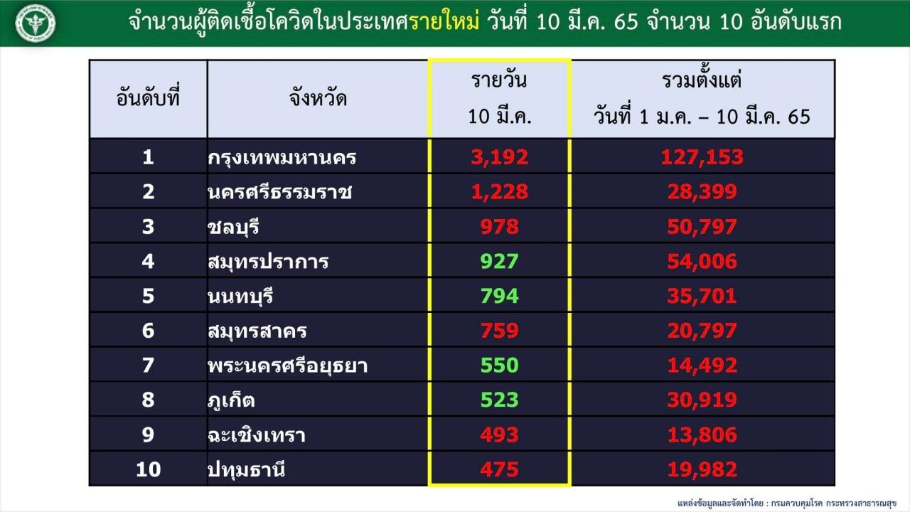 วันที่ 10 มีนาคม 2565 ที่ทำเนียบรัฐบาล แพทย์หญิงสุมนี วัชรสินธุ์ ผู้อำนวยการสำนักสื่อสารความเสี่ยงและพัฒนาพฤติกรรมสุขภาพ กรมควบคุมโรค ผู้ช่วยรองโฆษกศูนย์บริหารสถานการณ์การแพร่ระบาดของโรคติดเชื้อไวรัสโคโรนา 2019 (โควิด-19) หรือ ศบค. กล่าวถึงจังหวัดที่มีการติดเชื้อสูงสุดในวันนี้ ว่า ยังคงเป็นกรุงเทพมหานคร พบการติดเชื้อกว่า 3,000 ราย เป็นวันที่ 2 แล้ว นอกจากนี้ยังพบคลัสเตอร์เป็นโรงเรียนในเขตบางบอน ส่วน 5 เขตที่ติดเชื้อสูงสุด คือ สะพานสูง 170 ราย บางแค 152 ราย ป้อมปราบศัตรูพ่าย 128 ราย บางกอกน้อย 122 ราย และหนองแขม 121 ราย