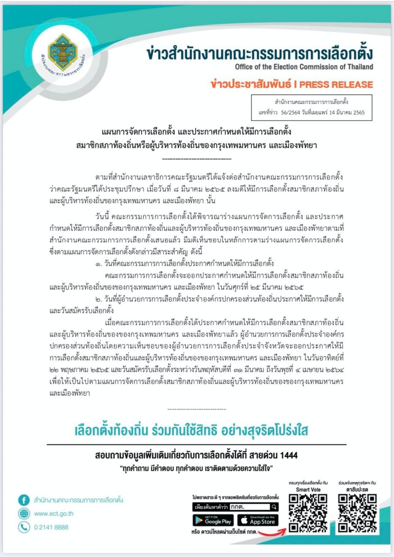 วันที่ 14 มี.ค. 2565 สำนักงานคณะกรรมการการเลือกตั้ง (กกต.) แจ้งว่า ตามที่สำนักงานเลขาธิการคณะรัฐมนตรีได้แจ้งต่อสำนักงาน กกต. ว่า คณะรัฐมนตรีได้ประชุมปรึกษา เมื่อวันที่ 8 มี.ค. 2565 ลงมติให้มีการเลือกตั้งสมาชิกสภาท้องถิ่นและผู้บริหารท้องถิ่นของกรุงเทพมหานคร และเมืองพัทยานั้น