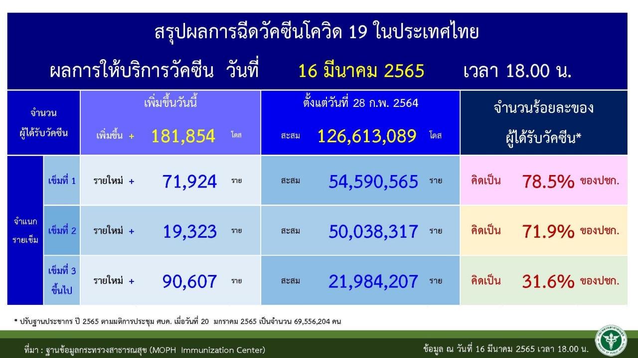 ส่วนยอดการฉีดวัคซีนตั้งแต่วันที่ 28 ก.พ. 2564-16 มี.ค. 2565 รวมฉีดสะสมอยู่ที่ 126,613,089 โดส