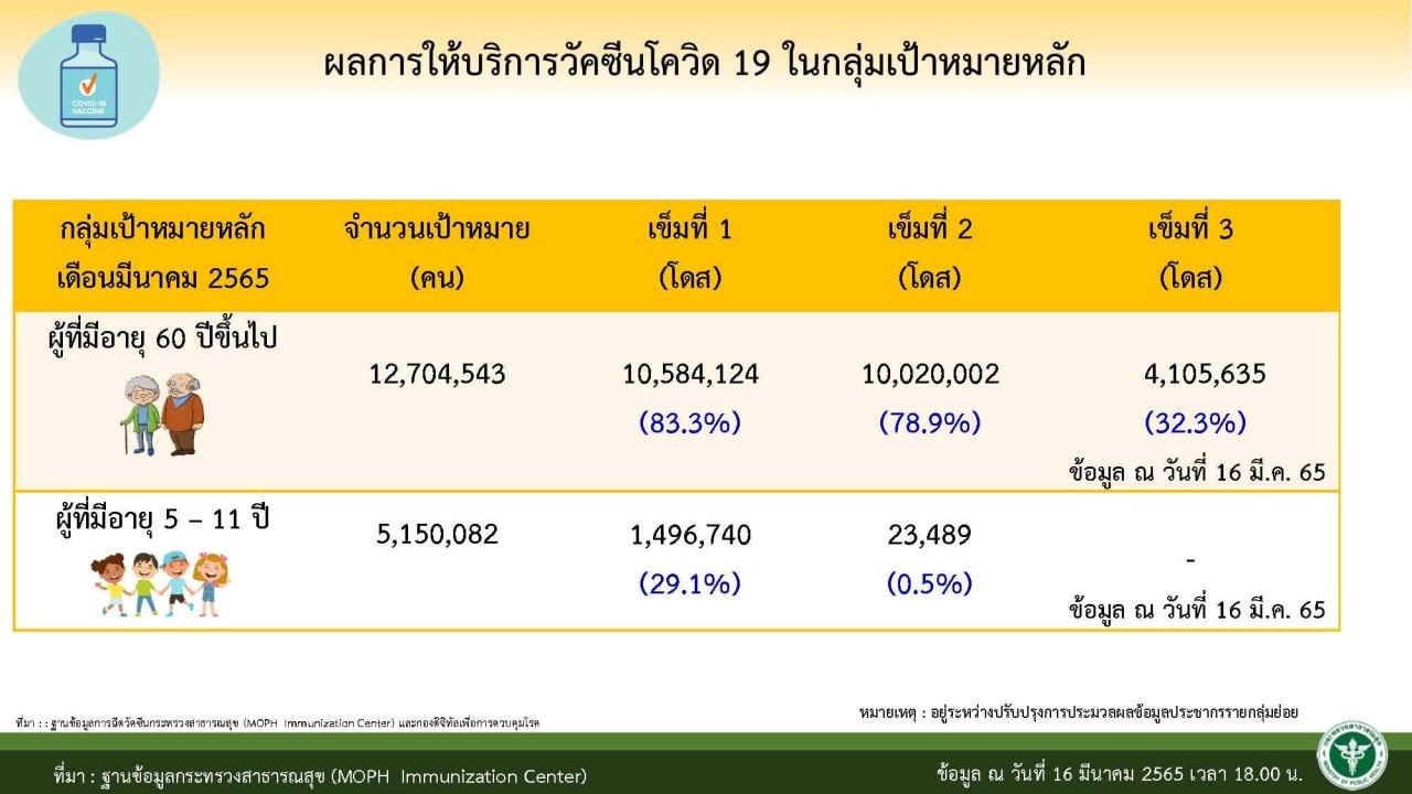 วันที่ 17 มีนาคม 2565 ศูนย์บริหารสถานการณ์การแพร่ระบาดของโรคติดเชื้อไวรัสโคโรนา 2019 (โควิด-19) หรือ ศบค. เปิดเผยผลการฉีดวัคซีน วันที่ 16 มี.ค. 2565 มีรายละเอียดดังนี้