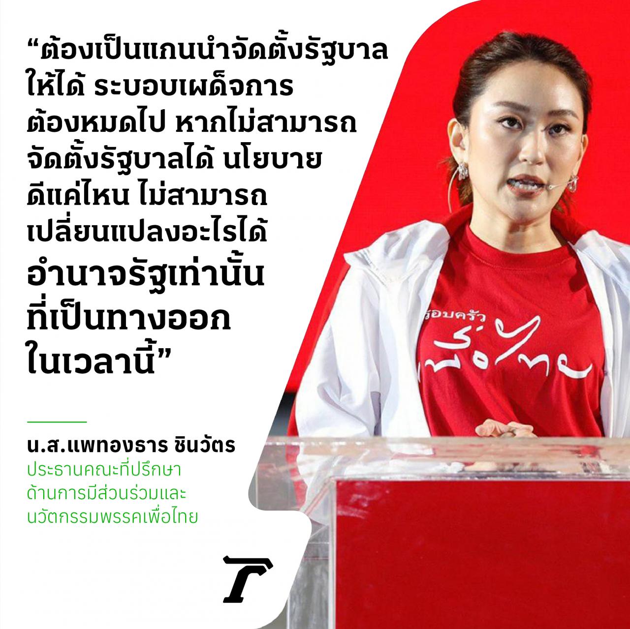 ยิ่ง "อุ๊งอิ๊ง" กล่าวบนเวที "เราต้องเป็นแกนนำจัดตั้งรัฐบาลให้ได้ ระบอบเผด็จการต้องหมดไป โดยการเตรียมความพร้อมเอาไว้ หากไม่สามารถสามารถจัดตั้งรัฐบาลได้ นโยบายจะดีแค่ไหน จะไม่สามารถเปลี่ยนแปลงอะไรได้ อำนาจรัฐเท่านั้นที่จะเป็นทางออกในเวลานี้ และเป็นจุดที่พรรคเพื่อไทยต้องไปให้ถึง"
