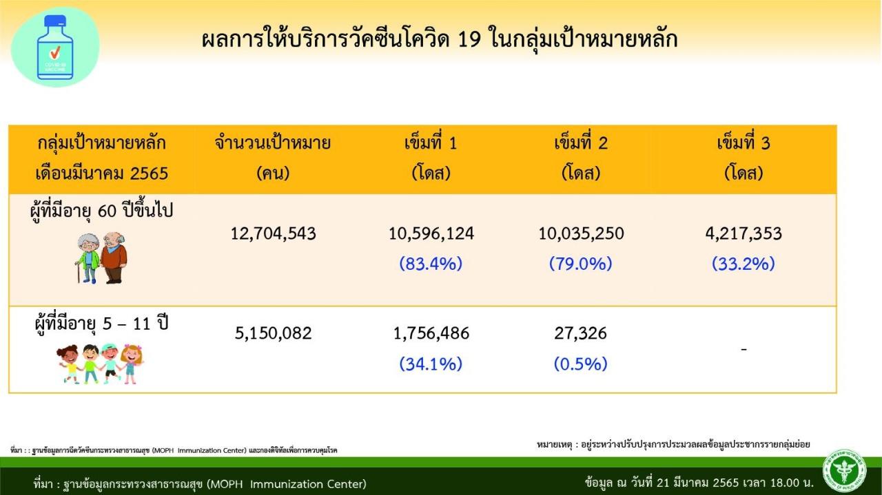 วันที่ 22 มีนาคม 2565 ศูนย์บริหารสถานการณ์การแพร่ระบาดของโรคติดเชื้อไวรัสโคโรนา 2019 (โควิด-19) หรือ ศบค. เปิดเผยผลการฉีดวัคซีน วันที่ 21 มี.ค. 2565 มีรายละเอียดดังนี้