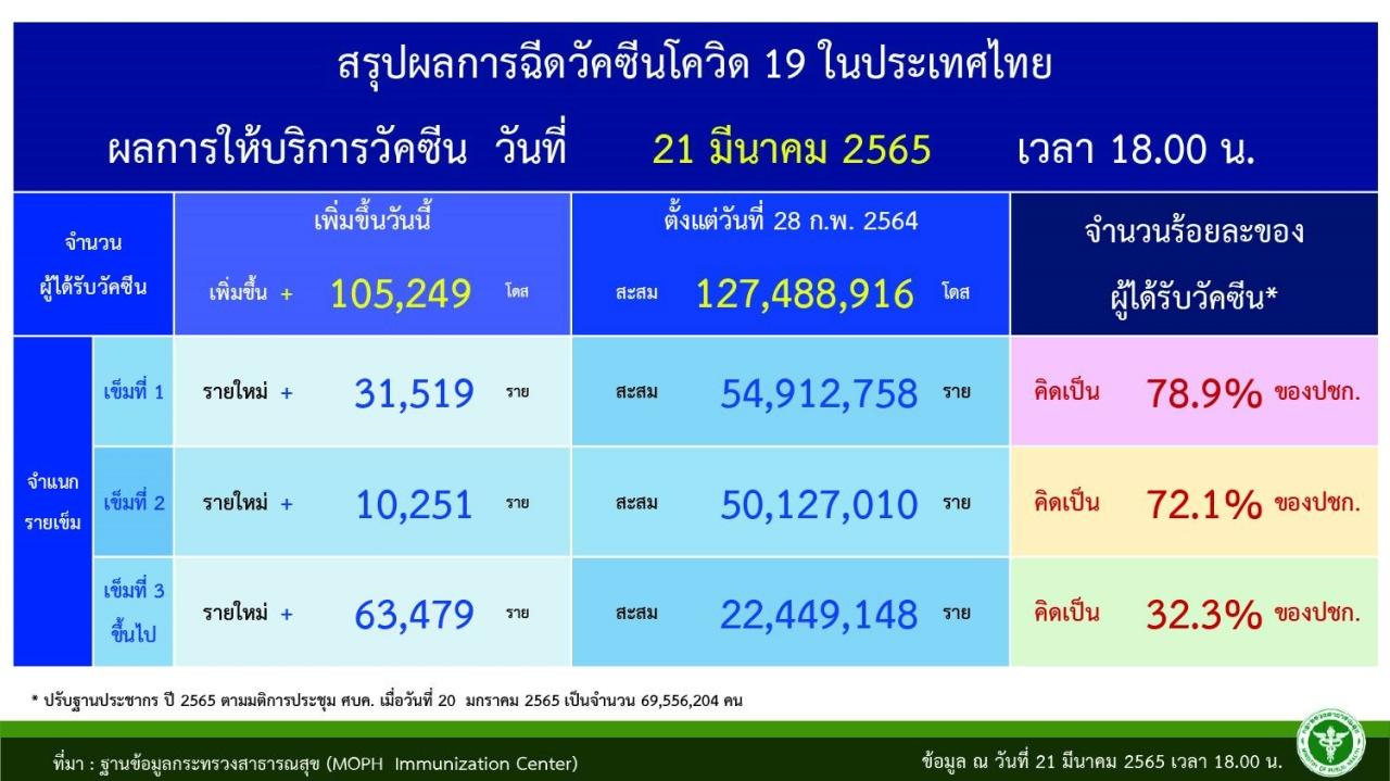 ส่วนยอดการฉีดวัคซีนตั้งแต่วันที่ 28 ก.พ. 2564-21 มี.ค. 2565 รวมฉีดสะสมอยู่ที่ 127,488,916 โดส