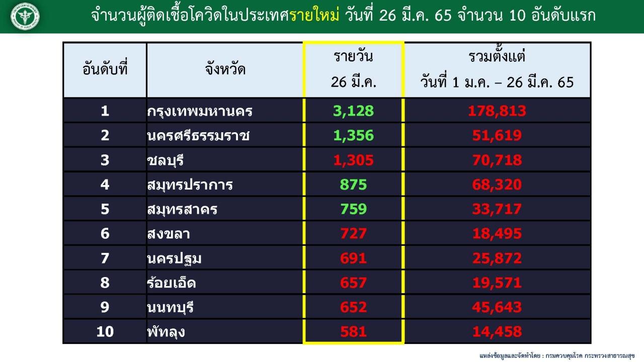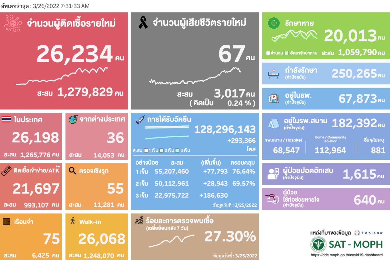 เมื่อเวลา 11.30 น. วันที่ 26 มี.ค. 2565 ศูนย์บริหารสถานการณ์การแพร่ระบาดของโรคติดเชื้อไวรัสโคโรนา 2019 (โควิด-19) หรือ ศบค. และกระทรวงสาธารณสุข รายงานสถานการณ์โควิด-19 ในประเทศไทย มีรายละเอียดดังนี้
