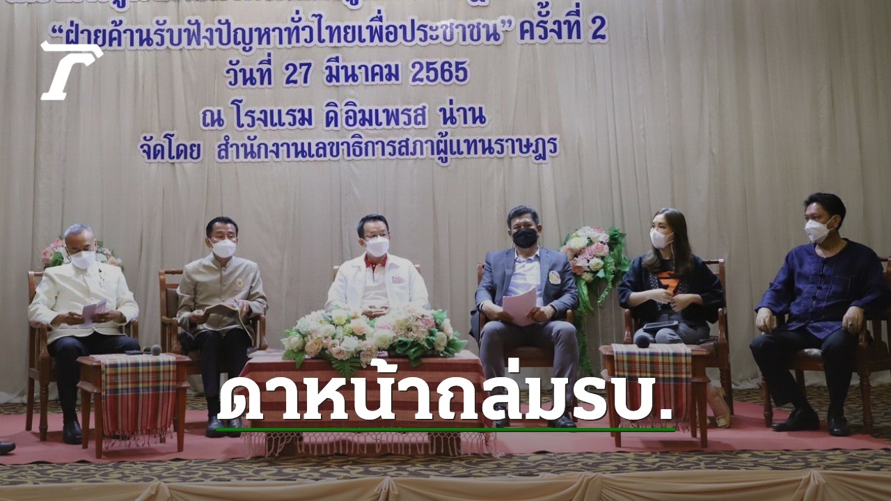 วันที่ 27 มี.ค. ที่โรงแรมดิอิมเพลสน่าน จ.น่าน พรรคร่วมฝ่ายค้าน จัดโครงการฝ่ายค้านพบประชาชน "ฝ่ายค้านรับฟังปัญหาทั่วไทยเพื่อประชาชน" ครั้งที่ 2 เป็นการเสวนาภายใต้หัวข้อ "ทั่วไทยทวงคืนอำนาจประชาชน : บริหารล้มเหลวซ้ำซาก ประชาชนจน ประเทศเจ๊ง"