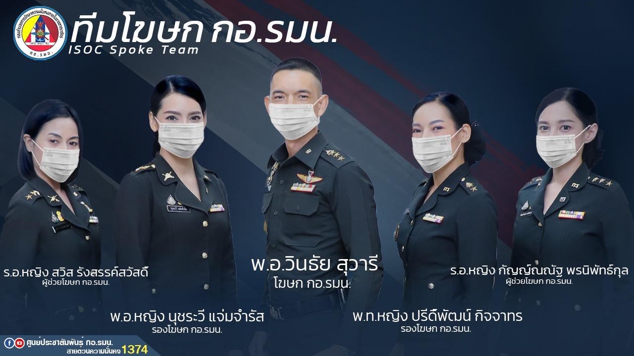 สำหรับทีมโฆษก กอ.รมน. ชุดนี้ นำโดย พันเอก วินธัย สุวารี ปฏิบัติหน้าที่ โฆษก กอ.รมน. พร้อมด้วย พันเอกหญิง นุชระวี แจ่มจำรัส และ พันโทหญิง ปรีดิ์พัฒน์ กิจจาทร เป็น รองโฆษก กอ.รมน., ร้อยเอกหญิง กัญญ์ณณัฐ พรนิพัทธ์กุล และ ร้อยเอกหญิง สวิส รังสรรค์สวัสดิ์ เป็น ผู้ช่วยโฆษก กอ.รมน. ภายใต้การกำกับดูแลของ พลเอก สันติพงศ์ ธรรมปิยะ เสธ.ทบ./เลขาธิการ กอ.รมน. ซึ่งทุกนายล้วนเป็น