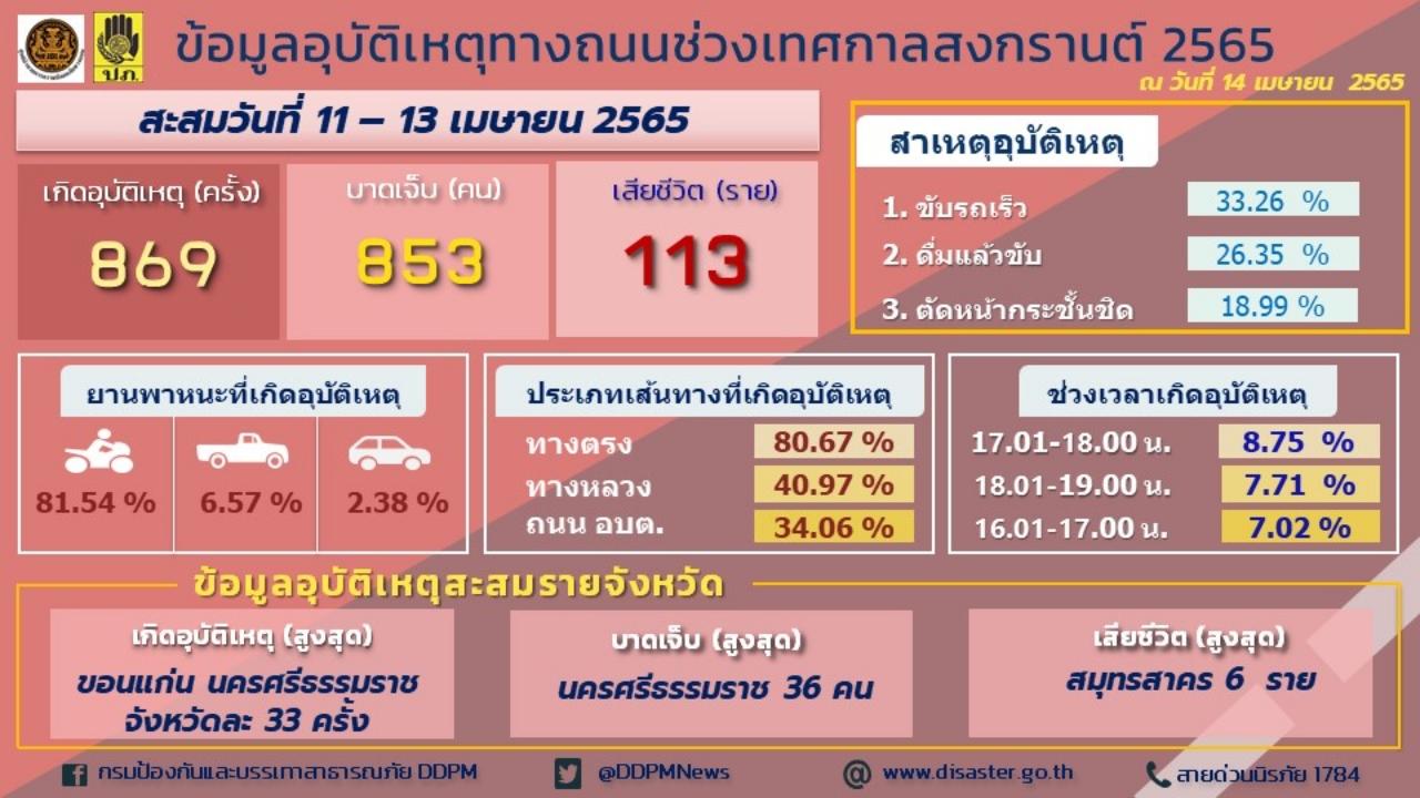 เมื่อเวลา 11.00 น. วันที่ 14 เม.ย. 2565 นายบุญธรรม เลิศสุขีเกษม อธิบดีกรมป้องกันและบรรเทาสาธารณภัย (ปภ.) ในฐานะเลขานุการศูนย์อำนวยการความปลอดภัยทางถนน (ศปถ.) แถลงข่าวว่า ศูนย์อำนวยการป้องกันและลดอุบัติเหตุทางถนนช่วงเทศกาลสงกรานต์ พ.ศ.2565 โดยกรมป้องกันและบรรเทาสาธารณภัย และความร่วมมือของหน่วยงานภาคีเครือข่ายได้รวบรวมสถิติอุบัติเหตุทางถนนประจำวันที่ 13 เม.ย. 2565 ซึ่งเป็นวันที่ 3 ของการรณรงค์ “ชีวิตวิถีใหม่ ขับขี่อย่างปลอดภัย ไร้อุบัติเหตุ” ดังนี้