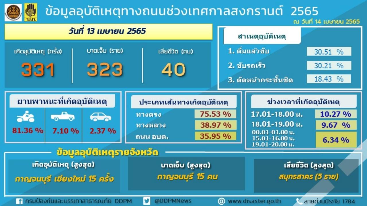 ศปถ. แถลงสรุป 7 วันอันตรายช่วงสงกรานต์ วันที่ 3 เสียชีวิต 40 บาดเจ็บ 323 คน อุบัติเหตุ 331 ครั้ง สาเหตุดื่มแล้วขับมากที่สุด รวมสถิติ 3 วัน สมุทรสาครยอดตายสูงสุด อีก 27 จังหวัด ยอดตายเป็น 0