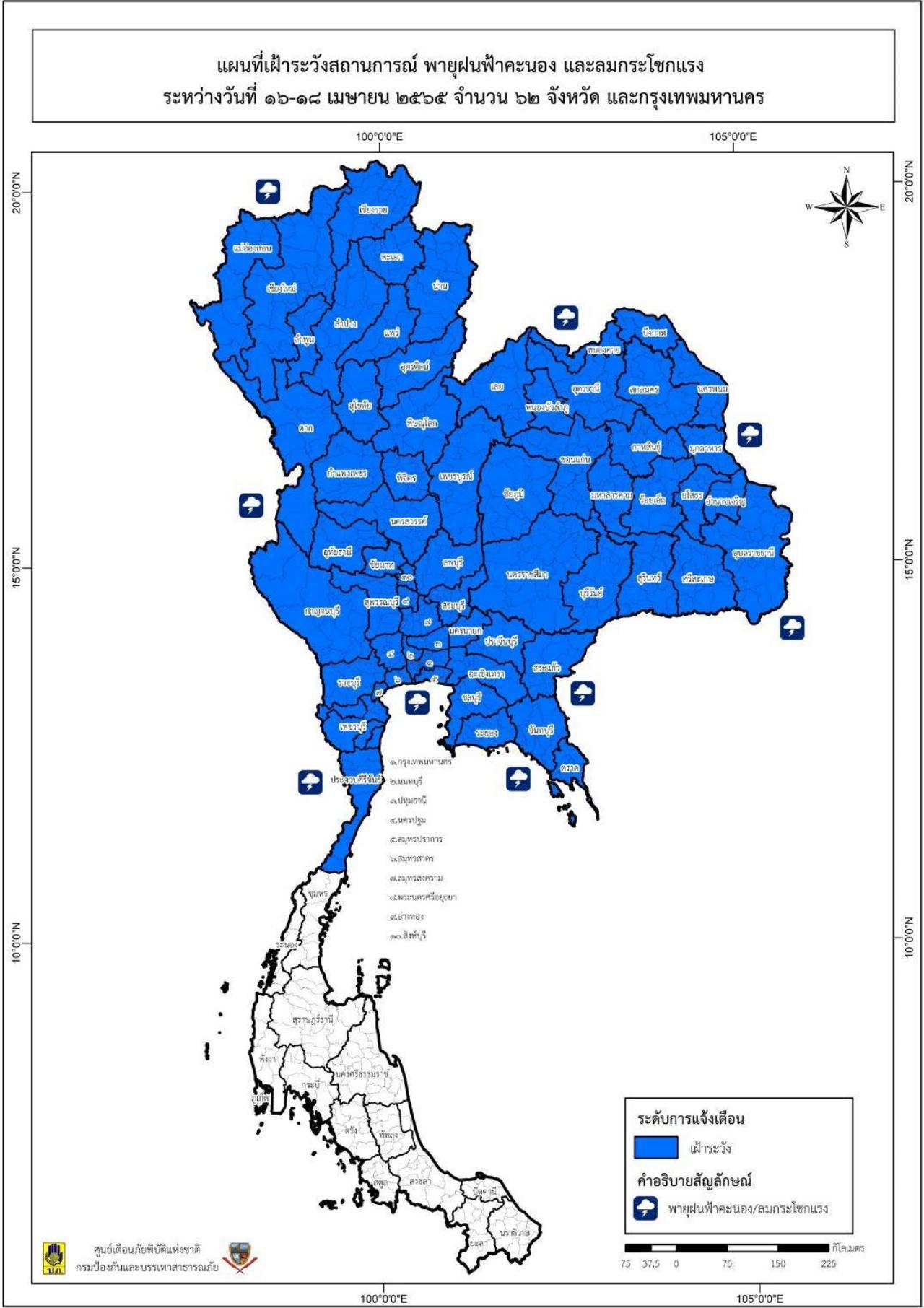 วันที่ 14 เมษายน 2565 กองอำนวยการป้องกันและบรรเทาสาธารณภัยกลาง (กอปภ.ก.) โดยกรมป้องกันและบรรเทาสาธารณภัย ได้ติดตามสภาวะอากาศและพิจารณาปัจจัยเสี่ยง ประกอบกับกรมอุตุนิยมวิทยาได้มีประกาศ ฉบับที่ 1 (69/2565) ลงวันที่ 14 เมษายน 2565 แจ้งว่า ช่วงวันที่ 16 - 18 เมษายน 2565 บริเวณความกดอากาศสูงหรือมวลอากาศเย็นกำลังปานกลางจากสาธารณรัฐประชาชนจีนจะแผ่ลงมาปกคลุมประเทศไทยตอนบนและทะเลจีนใต้ ประกอบกับลมใต้และลมตะวันออกเฉียงใต้พัดปกคลุมประเทศไทยตอนบน ขณะที่ประเทศไทยมีอากาศร้อนถึงร้อนจัด ทำให้มีพายุฤดูร้อน โดยมีพายุฝนฟ้าคะนอง ลมกระโชกแรง และลูกเห็บตกบางพื้นที่ รวมถึงอาจมีฟ้าผ่าเกิดขึ้น โดยมีพื้นที่เฝ้าระวังสถานการณ์ฝนฟ้าคะนองและลมกระโชกแรงบริเวณภาคเหนือ ภาคตะวันออกเฉียงเหนือ ภาคกลาง รวมทั้งกรุงเทพมหานคร