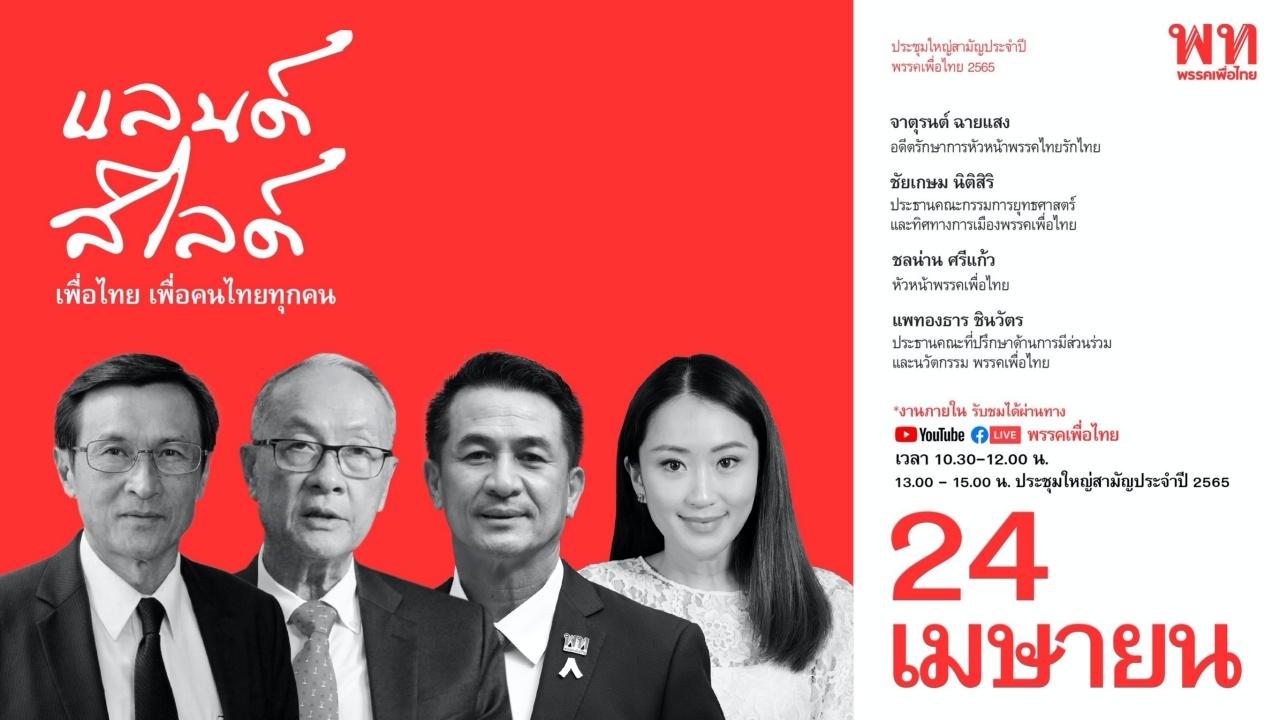 วันที่ 20 เม.ย. นายประเสริฐ จันทรรวงทอง ส.ส.นครราชสีมา และเลขาธิการพรรคเพื่อไทย กล่าวว่า พรรคเพื่อไทย กำหนดให้มีการจัดประชุมใหญ่สามัญประจำปี 2565 ในวันที่ 24 เมษายน 2565 ภายใต้ชื่องาน "แลนด์สไลด์ เพื่อไทย เพื่อคนไทยทุกคน" ซึ่งเรามุ่งหมายที่จะใช้เวทีการประชุมใหญ่ของพรรคครั้งนี้ในการสื่อสารสาธารณะไปถึงพี่น้องประชาชนทุกคนที่กำลังเผชิญกับวิกฤิต่างๆ อันเกิดขึ้นจากความผิดพลาดบกพร่องของรัฐบาล ที่ไร้ความสามารถไร้ประสิทธิภาพชุดนี้ ในวันที่พี่น้องประชาชนเดือดร้อนอันแสนสาหัส มืดมนไร้หนทางไร้ความหวัง เราเชื่อมั่นว่า พรรคเพื่อไทย คือ ทางออกของประเทศและพี่น้องประชาชน