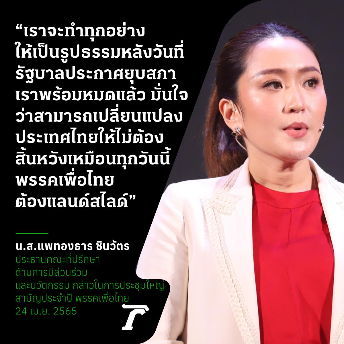 เมื่อเวลา 11.27 น. วันที่ 24 เม.ย. 2565 น.ส.แพทองธาร ชินวัตร ประธานคณะที่ปรึกษาด้านการมีส่วนร่วมและนวัตกรรม ลูกสาวคนเล็กของ นายทักษิณ ชินวัตร อดีตนายกรัฐมนตรี ขึ้นกล่าวปราศรัยบนเวทีการประชุมใหญ่สามัญประจำปี 2565 ของพรรคเพื่อไทย ขอยืนยันว่าจะไม่ทิ้งคนรากหญ้าซึ่งเป็นคนส่วนใหญ่ของประเทศ แม้เสียงจะไม่ดังเท่าคนส่วนน้อย อยากใช้ความรู้สมัยใหม่นำพาให้พ้นจากความยากจน ให้โอกาสคนเหล่านี้ได้มีศักดิ์ศรีกลับมาภูมิใจในฐานะประชาชนคนหนึ่ง ยืนยันว่าจะใช้สติปัญหาบริหารประเทศ แก้ปัญหาปากท้องพี่น้องประชาชนให้ได้ มั่นใจว่าชีวิตจะดีขึ้น