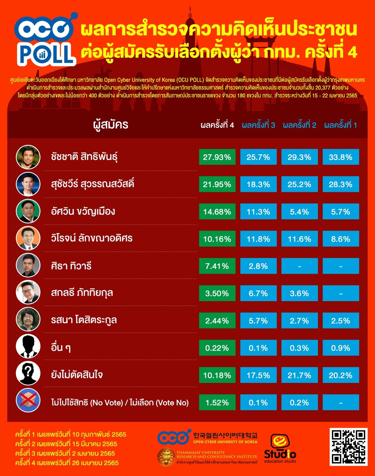 วันที่ 26 เม.ย.65 สำนักงานศูนย์วิจัยและให้คำปรึกษาแห่งมหาวิทยาลัยธรรมศาสตร์ เผยแพร่ผลสำรวจความคิดเห็นประชาชนต่อ ว่าที่ ผู้ว่าฯกทม.ครั้งที่ 4 โดยได้รับทุนสนับสนุนจากศูนย์เอเชียตะวันออกเฉียงใต้ศึกษา มหาวิทยาลัย Open Cyber University of Korea (OCU POLL) จัดสำรวจความคิดเห็นของประชาชนที่มีต่อผู้สมัครรับเลือกตั้งผู้ว่ากรุงเทพมหานคร ดำเนินการสำรวจและประมวลผลผ่านสำนักงานศูนย์วิจัยและให้คำปรึกษาแห่งมหาวิทยาลัยธรรมศาสตร์