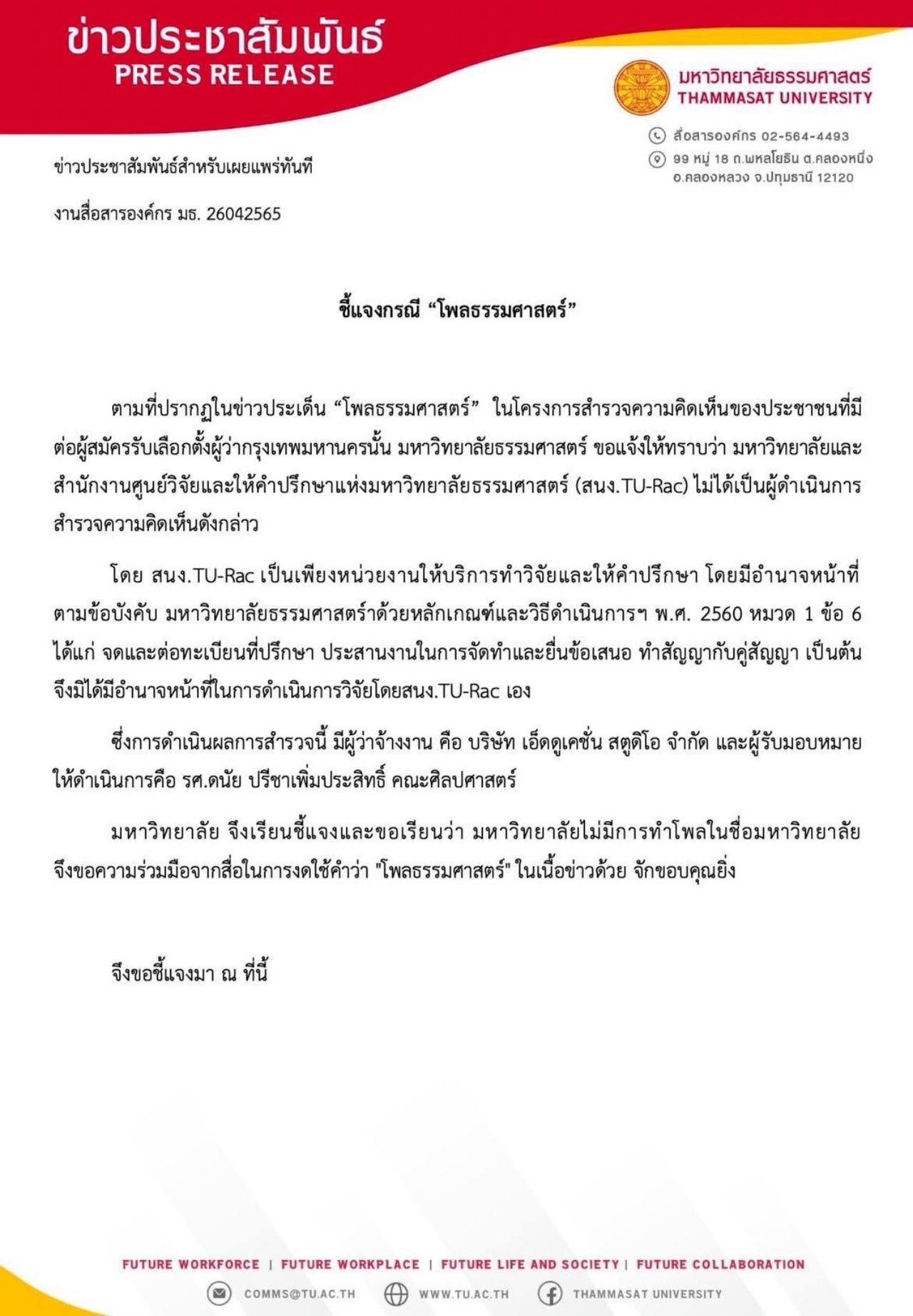 มหาวิทยาลัยธรรมศาสตร์ ขอแจ้งให้ทราบว่า มหาวิทยาลัยและสำนักงานศูนย์วิจัยและให้คำปรึกษาแห่งมหาวิทยาลัยธรรมศาสตร์ (สนง.TU-Rac) ไม่ได้เป็นผู้ดำเนินการสำรวจความคิดเห็นดังกล่าว โดยสนง.TU-Rac เป็นเพียงหน่วยงานให้บริการทำวิจัยและให้คำปรึกษา โดยมีอำนาจหน้าที่ตามข้อบังคับ มหาวิทยาลัยธรรมศาสตร์ด้วยหลักเกณฑ์และวิธีดำเนินการฯ พ.ศ. 2560 หมวด 1 ข้อ 6 ได้แก่ จดและต่อทะเบียนที่ปรึกษา ประสานงานในการจัดทำและยื่นข้อเสนอ ทำสัญญากับคู่สัญญา เป็นต้น จึงมิได้มีอำนาจหน้าที่ในการดำเนินการวิจัยโดย สนง.TU-Rac เอง