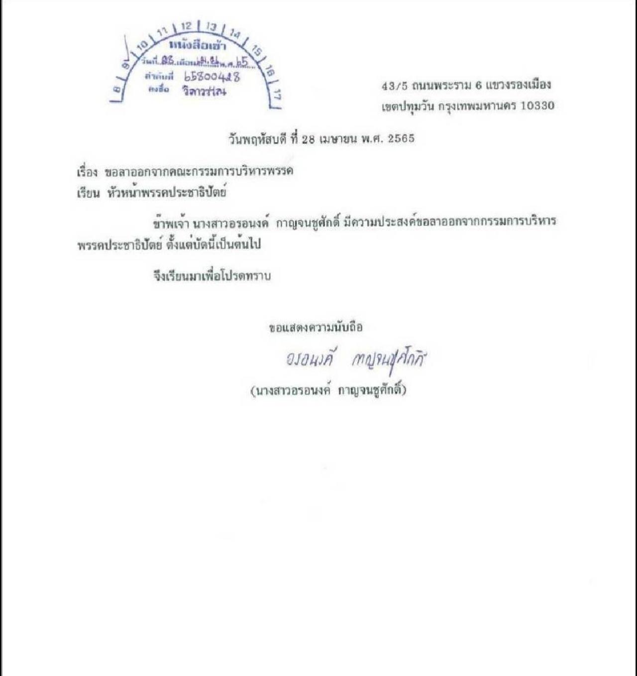 วันที่ 29 เม.ย. 2565 ผู้สื่อข่าวรายงานจากพรรคประชาธิปัตย์ว่า เมื่อวันที่ 28 เม.ย. ที่ผ่านมา น.ส.อรอนงค์ กาญจนชูศักดิ์ อดีตส.ส. กทม.พรรคประชาธิปัตย์และเป็นคณะกรรมการบริหาร (กก.บห.) พรรคได้ทำหนังสือยื่นใบลาออกจากการเป็นคณะกก.บห.พรรคประชาธิปัตย์ ซึ่งมีผลให้น.ส.อรอนงค์ พ้นจาก กก.บห. ทันที