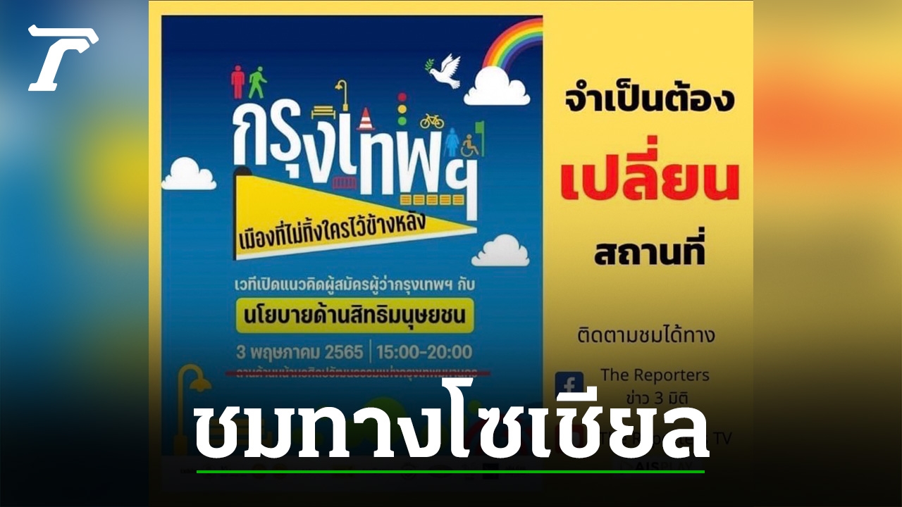 วันที่ 2 พ.ค. 65 ผู้สื่อข่าวรายงานว่า The Reporters โพสต์เฟซบุ๊ก ว่า ทางสำนักงานเขตปทุมวัน ไม่อนุญาตให้จัดเวทีเปิดวิสัยทัศน์ ผู้สมัคร ผู้ว่าฯ กทม.กับนโยบายด้านสิทธิมนุษยชน "กรุงเทพฯ เมืองที่ไม่ทิ้งใครไว้ข้างหลัง" ขณะที่ผู้จัด ยังยืนยัน จัดเวทีเหมือนเดิม แต่ต้องย้ายไปสถานที่ปิด และรับชมทางออนไลน์ เพราะไม่สามารถขออนุญาตสถานที่เปิดให้คนเข้ารับฟังได้ทัน