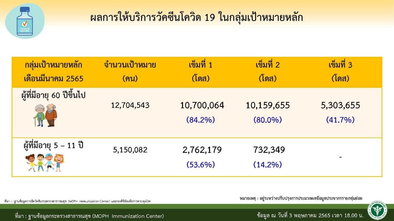 พญ.สุมนี ยังกล่าวถึงกลุ่มเสี่ยงที่ได้รับวัคซีน คือกลุ่มผู้สูงอายุ 60 ปีขึ้นไป รับวัคซีนเข็มที่ 3 แล้ว 5,303,655 ราย หรือ 41.7% ซึ่งยังมีความจำเป็นในการรณรงค์ให้บุตรหลานรีบพาไปฉีดวัคซีน เนื่องจากเป้าหมาย อยู่ที่ 60% ขึ้นไป ขณะที่กลุ่มเด็กอายุ 5-11 ปี จากข้อมูลพบว่าผู้ป่วยเด็กยังมีถึง 14% และยังมีรายงานมาอย่างต่อเนื่อง จึงขอให้ไปรับวัคซีน เนื่องจากมีการฉีดเข็มที่ 2 เพียง 14.2% โดยถือว่ายังน้อยอยู่มาก