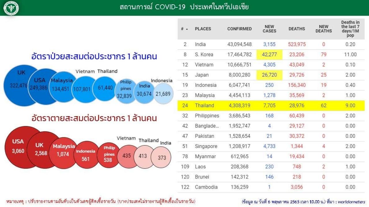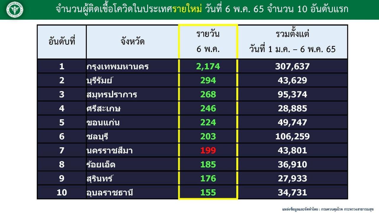 เมื่อเวลา 12.00 น. วันที่ 6 พ.ค. 2565 ศูนย์บริหารสถานการณ์การแพร่ระบาดของโรคติดเชื้อไวรัสโคโรนา 2019 (โควิด-19) หรือ ศบค. และกระทรวงสาธารณสุข รายงานสถานการณ์โควิด-19 ในประเทศไทย มีรายละเอียดดังนี้