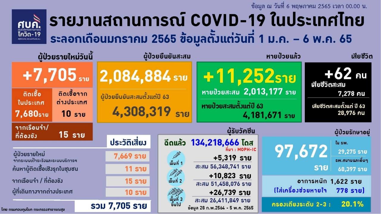 ศบค. รายงานสถานการณ์โควิด 6 พ.ค. 65 ผู้ติดเชื้อต่ำกว่าหมื่นต่อเนื่อง วันนี้ 7,705 ราย เสียชีวิตเพิ่ม 62 ศพ ผู้ป่วยปอดอักเสบกำลังรักษา 1,622 ราย ส่วนผลตรวจ ATK เป็นบวกอีก 5,288 ราย