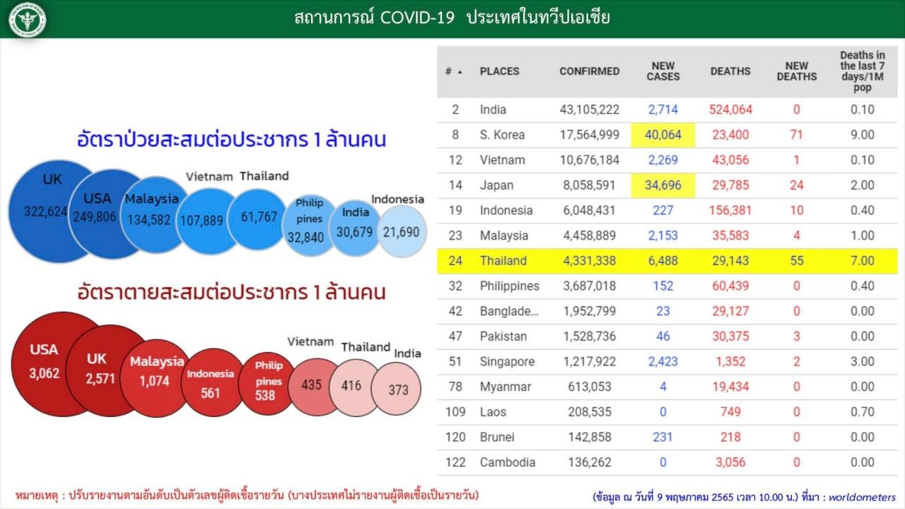 ศบค. รายงานสถานการณ์โควิดวันนี้ 9 พ.ค. 65 ติดเชื้อ 6,488 ราย ยอด ATK พบเข้าข่ายอีก 4,945 ราย รวมติดเชื้อวันนี้ 11,429 ราย เสียชีวิต 55 ศพ อาการหนัก 1,522 ราย ใส่เครื่องช่วยหายใจ 738 ราย