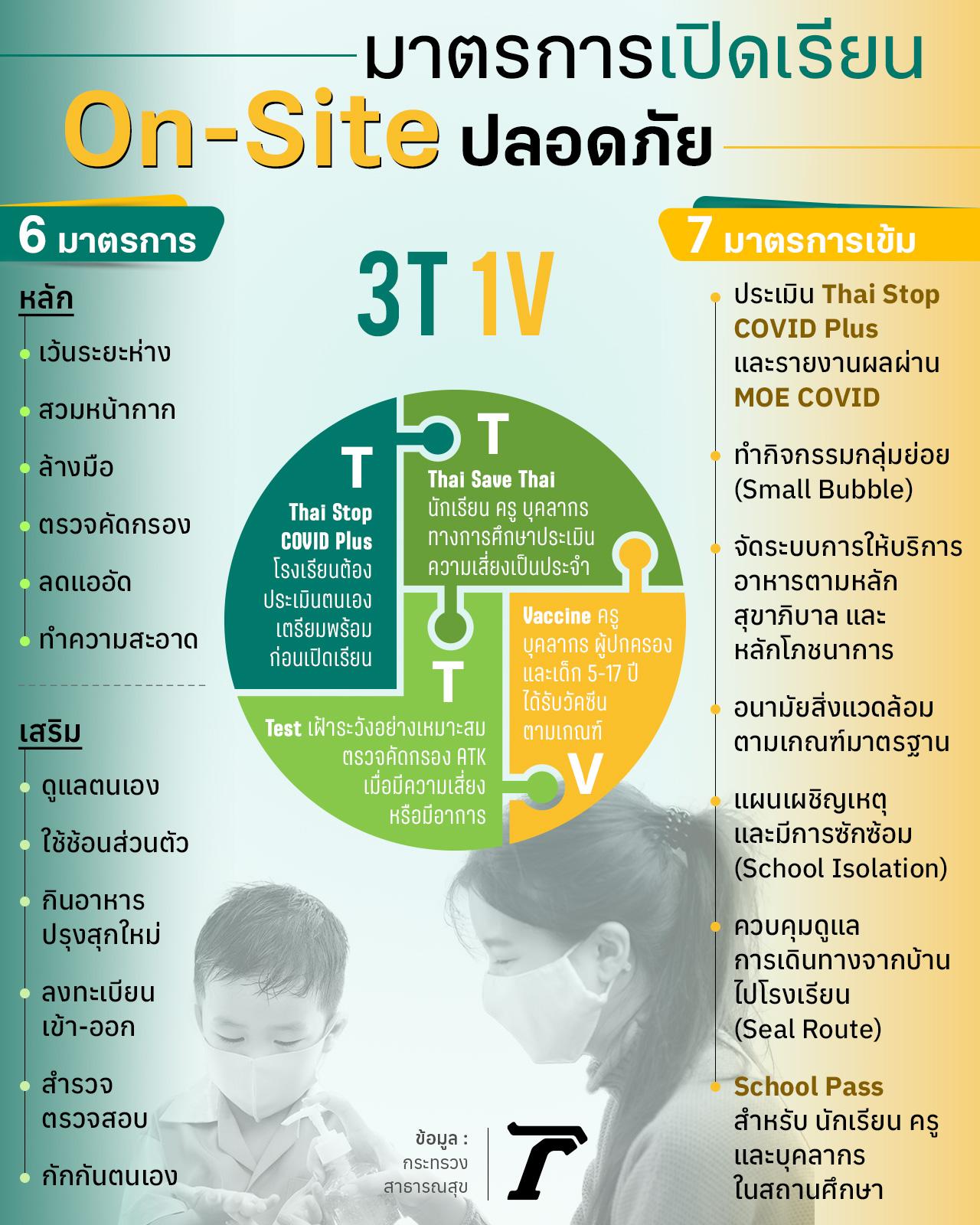 - เน้นย้ำมาตรการ 3T 1V และ 6-6-7 เพื่อความปลอดภัย ให้อยู่ได้กับโควิด-19 แนะ อาการและความเสี่ยงแบบไหนเรียนต่อได้ หรือต้องปิดห้องเรียน