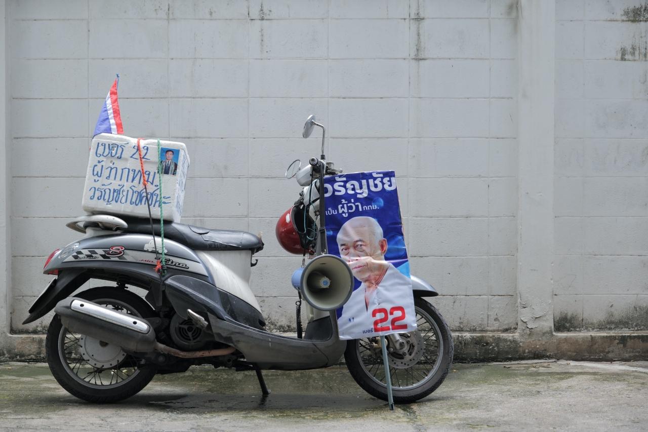 - ป้ายหาเสียง โทรโข่ง ลังติดรูปกับมอเตอร์ไซค์คู่ใจ เอกลักษณ์ที่ไม่ซ้ำใคร และไม่มีใครเหมือน คล่องตัว หาที่จอดง่าย เวลาจอดติดไฟแดงคนเห็นชัดดี