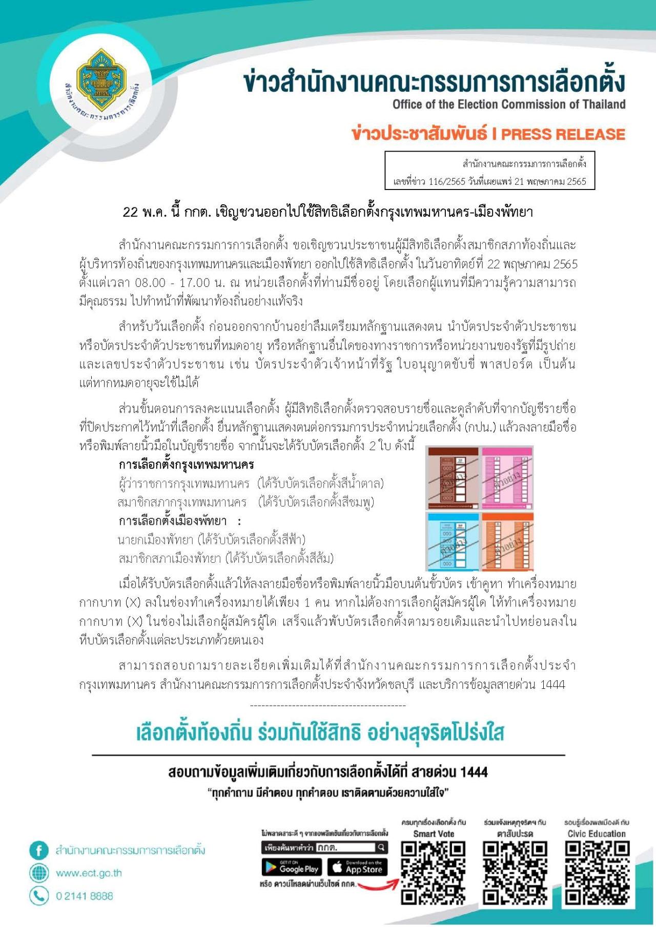 วันที่ 21 พ.ค. 2565 สำนักงานคณะกรรมการการเลือกตั้ง (กกต.) เน้นย้ำประชาสัมพันธ์ เชิญชวนประชาชนใช้สิทธิ์เลือกตั้งผู้ว่าราชการกรุงเทพมหานคร (ผู้ว่าฯ กทม.) สมาชิกสภากรุงเทพมหานคร และเลือกตั้งนายกเมืองพัทยา สมาชิกสภาเมืองพัทยา ในวันอาทิตย์ที่ 22 พ.ค. 2565 ตั้งแต่เวลา 08.00-17.00 น. พร้อมเน้นย้ำสีบัตรเลือกตั้งแต่ละประเภท ดังนี้