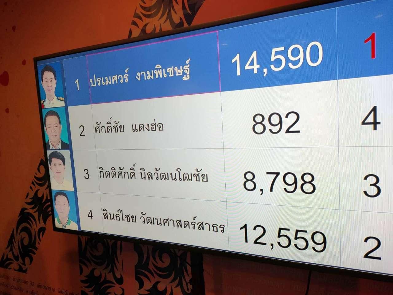 เมื่อเวลา 20.00 น. วันที่ 22 พ.ค.2565 ผลการนับคะแนนเลือกตั้งนายก และ สมาชิกสภาเมืองพัทยา อย่างไม่เป็นทางการ ที่มีการนับไปแล้วกว่า 51% ผลตอนนี้ เบอร์ 1 เบียร์ ปรเมศวร์ งามพิเชษฐ์ กลุ่มเรารักพัทยา นำเป็นอันดับ 1 ด้วยคะแนน 14,590 ทิ้งห่าง นายสินธ์ไชย วัฒนศาสตร์สาธร ผู้สมัครหมายเลข 4 กลุ่มพัทยาร่วมใจ คะแนนอยู่ที่ 12,559 ห่างกัน ประมาณ 2,031 คะแนน ตามด้วยเบอร์ 3 นายกิตติศักดิ์ นิลวัฒนโฒชัย คณะก้าวหน้า คะแนน 8,798 และ นายศักดิ์ชัย แตงฮ่อ ผู้สมัครอิสระ คะแนน 892