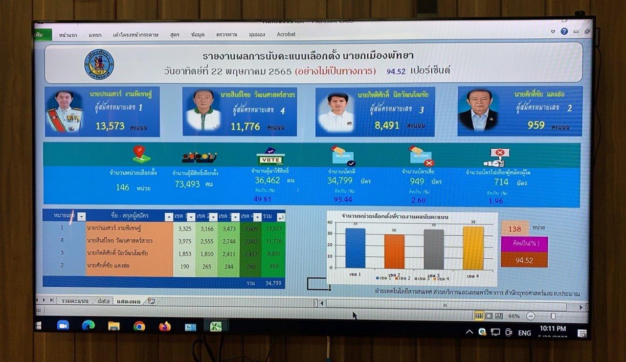เมื่อเวลา 21.30 น. วันที่ 22 พ.ค.65 คณะกรรมการการเลือกตั้งเมืองพัทยา โดย นางสาววิชชุดา เมฆานุวงศ์ ผอ.กกต.จ.ชลบุรี และเรือตรีปราโมทย์ ทับทิม ผอ.กกต.เมืองพัทยา ได้ดำเนินการรับใบสรุปผลนับคะแนนเลือกตั้งนายกเมืองพัทยาและสมาชิกสภาเมืองพัทยา จากทั้ง 146 หน่วยเลือกตั้ง โดยพบว่าตัวแทนแต่ละหน่วยเลือกตั้ง รวม 4 เขต ได้ทยอยนำมาส่งมอบที่ห้องทัพพระยา 401 ศาลาว่าการเมืองพัทยา จ.ชลบุรี ท่ามกลางกองทัพสื่อมวลชนแขนงต่างๆ ทั้งจากส่วนกลาง และท้องถิ่นเข้าร่วมสังเกตการณ์ และเกาะติดสถานการณ์เพื่อรายงานข่าวกันอย่างคับคั่ง