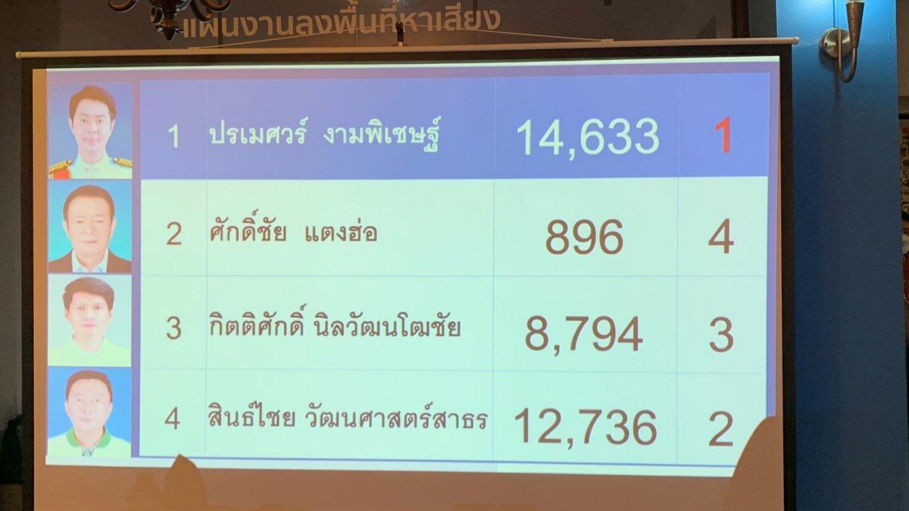 ทั้งนี้ สำหรับผลการนับคะแนนเสียงเลือกตั้งนายกเมืองพัทยา และสมาชิกสภาเมืองพัทยาอย่างไม่เป็นทางการ ผลปรากฏว่า นายปรเมศวร์ งามพิเชษฐ์ ผู้สมัครนายกเมืองพัทยา กลุ่มเรารักพัทยา หมายเลข 1 ได้คะแนนเสียงสูงสุดอยู่ที่ 14,633 คะแนน โดยชนะการเลือกตั้งทั้ง 4 เขต