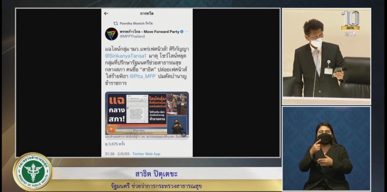 เมื่อเวลา 23.39 น. วันที่ 2 มิ.ย. 2565 ที่อาคารรัฐสภา ในการประชุมสภาผู้แทนราษฎร ครั้งที่ 4 (สมัยสามัญประจำปีครั้งที่หนึ่ง) เพื่อพิจารณาเรื่องด่วน ร่างพระราชบัญญัติงบประมาณรายจ่ายประจำปีงบประมาณ พ.ศ.2566 (คณะรัฐมนตรีเป็นผู้เสนอ) วงเงิน 3.18 ล้านล้านบาท นายสาธิต ปิตุเตชะ รัฐมนตรีช่วยว่าการกระทรวงสาธารณสุข รองหัวหน้าพรรคประชาธิปัตย์ ได้กล่าวอภิปรายขอใช้สิทธิ์พาดพิง กรณีที่ น.ส.ศิริกัญญา ตันสกุล ส.ส.บัญชีรายชื่อ พรรคก้าวไกล โชว์ไลน์หลุดในกลุ่มที่ปรึกษารัฐมนตรีช่วยว่าการกระทรวงสาธารณสุขของตนเอง ระบุว่า ตอนแรกตนเองไม่ติดใจ แต่พบว่ามีการนำไปโพสต์ในเพจของพรรคก้าวไกล และใช้คำพูดที่คิดว่าจะทำให้ตนเองเสียหาย ในทำนองว่าแฉไลน์กลุ่ม รัฐมนตรีช่วยสาธารณสุขแพร่เฟกนิวส์