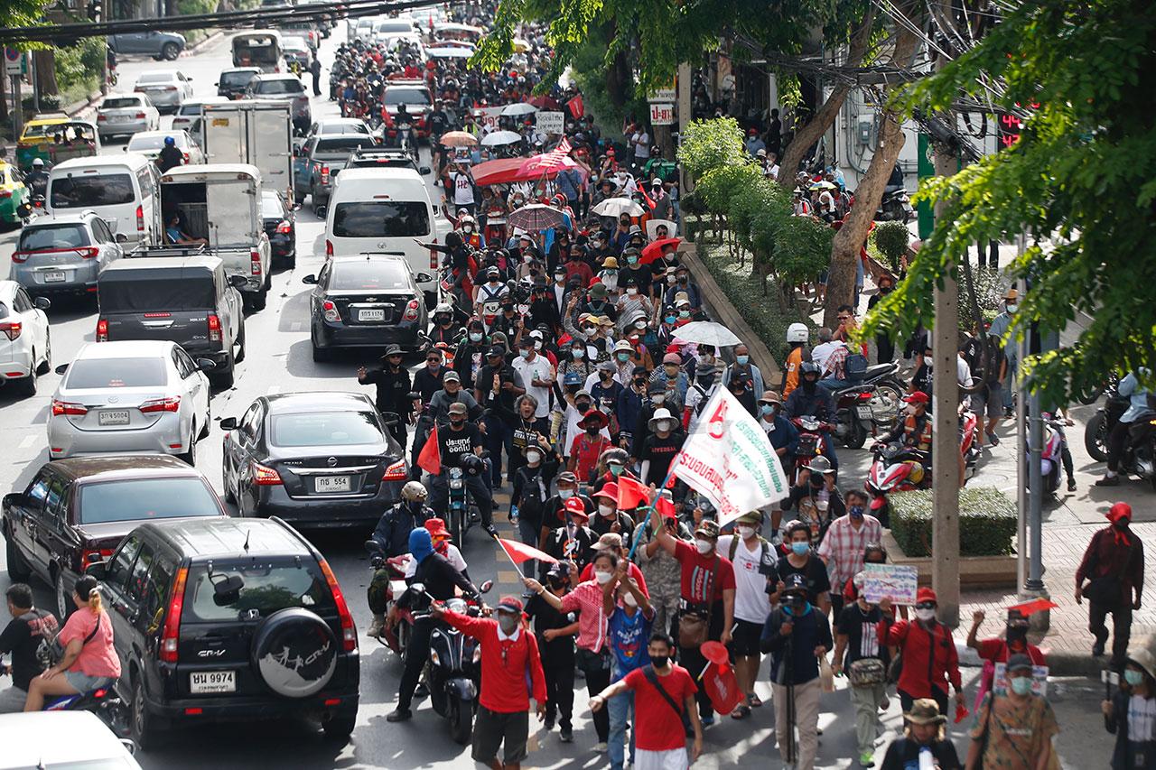 จากนั้นเวลา 15.35 น. นายวีรวิชญ์ รุ่งเรืองศิริผล อายุ 62 ปี เสื้อแดงรุ่นใหญ่ ประกาศให้มวลชนตั้งขบวนบนถนนราชดำเนินกลาง แล้วเคลื่อนตัวไปยังอนุสาวรีย์ชัยสมรภูมิ หัวขบวนเป็นชายฉกรรจ์วัยรุ่นทะลุแก๊สขับขี่จักรยานยนต์บีบแตรเสียงดัง ตามด้วยขบวนเดินเท้า ส่วนใหญ่เป็นชายหญิงสูงอายุ ต้องแจกยาดมยาหม่องไปตลอดทาง และยังมีรถซาเล้ง รถยนต์กระบะติดเครื่องขยายเสียง โดยนายไพศาล จันปาน อายุ 50 ปี แกนนำเสื้อแดงรุ่นใหญ่ ถือโทรโข่งสื่อสารกับมวลชนในขบวน เชิญชวนผู้คนสองข้างทางเข้าร่วม โดยม็อบเดินเท้าไล่ตู่เคลื่อนผ่านแยกผ่านฟ้า เข้าถนนนครสวรรค์ ถนนพิษณุโลก ถนนเพชรบุรี ถนนพญาไท ตลอดทางมีการโบกธงแดง ชูป้ายประณามรัฐบาล สถาบันตุลาการ ยกเลิก 112 พร้อมตะโกนไล่ พล.อ.ประยุทธ์ออกจากตำแหน่ง ทั้งนี้ นางวรวรรณ แซ่อั้ง หรือป้าเป้า นายชินวัตร จันทร์กระจ่าง หรือไบรท์ นพ.ทศพร เสรีรักษ์ อดีตโฆษกประจำสำนักนายกฯในรัฐบาล น.ส.ยิ่งลักษณ์ ชินวัตร ร่วมเดินขบวน เป็นที่น่าสังเกตว่าไร้เงามวลชนวัยรุ่นหนุ่มสาวนักศึกษาและแกนนำคนสำคัญๆของม็อบราษฏร ที่เคยเป็นหัวหอกและมวลชนกลุ่มหลักในม็อบ