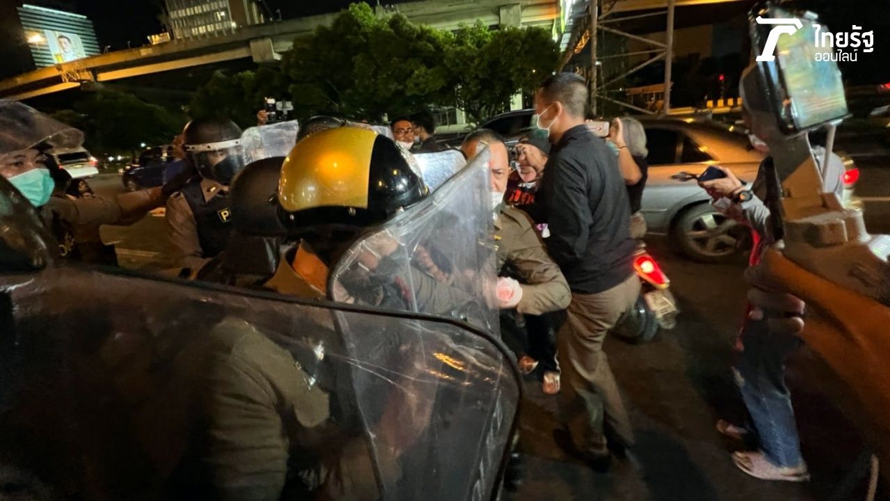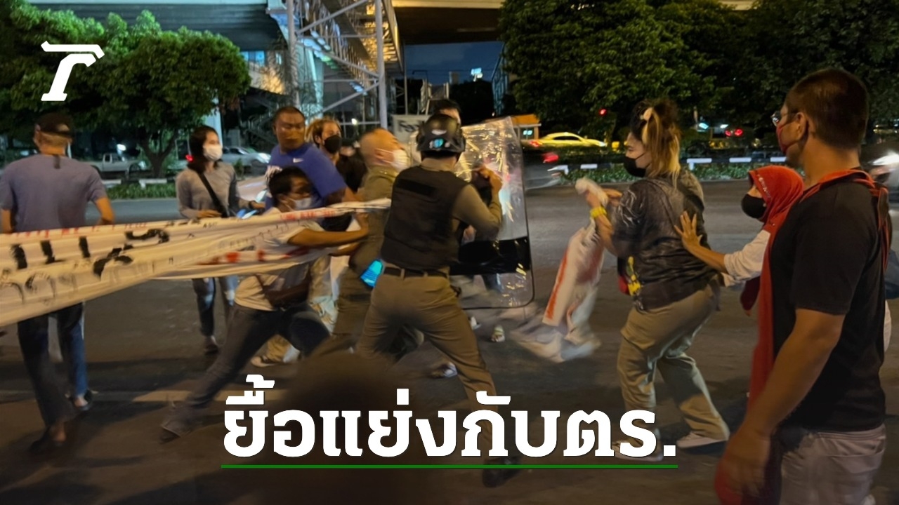 ชุลมุน! ม็อบ 14 มิถุนา 65 ตร.ควบคุมฝูงชนตั้งแถว ปะทะยื้อแย่งป้ายผ้ากลุ่มผู้ชุมนุม ขณะเดินขบวนมุ่งหน้าไปบ้านพัก นายกฯ "ป้าเป้า" ได้รับบาดเจ็บ ขณะที่ก่อนหน้า ผู้ชุมนุมมีการ จัดกิจกรรม"ยืนหยุดขัง- เขียนป้ายผ้า"