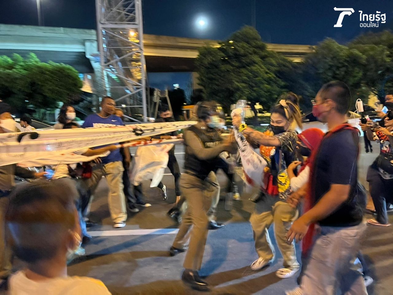 วันที่ 14 มิ.ย. 65 ที่บริเวณแยกใต้ทางด่วนดินแดง เมื่อเวลา 20.10 น. ผู้สื่อข่าวรายงานว่า เกิดเหตุชุลมุนระหว่างกลุ่มผู้ชุมนุมที่ถือป้ายผ้า ขณะเดินขบวนมุ่งหน้าไปบ้านพัก พล.อ.ประยุทธ์ จันทร์โอชา นายกรัฐมนตรีและรมว.กลาโหม ก่อนที่จะมีเจ้าหน้าที่ตำรวจควบคุมฝูงชน (คฝ.) ตั้งแนว และพยายามผลักดันกลุ่มผู้ชุมนุมที่กำลังเคลื่อนขบวน เพื่อให้กลับไปที่บริเวณสามเหลี่ยมดินแดง โดยไม่ให้กีดขวางการจราจร ทั้งนี้มีการยื้อแย่งป้ายผ้ากันระหว่างตำรวจ จนเกิดการปะทะและล้มระเนระนาด